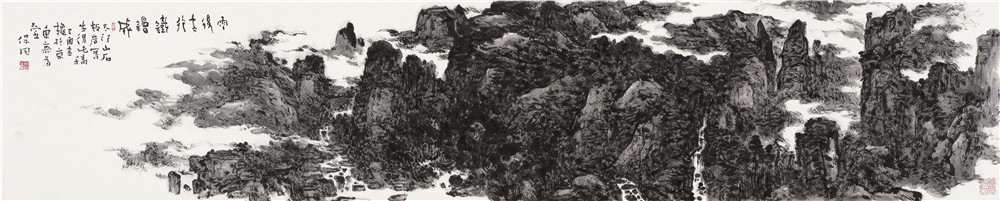 髡残的画,笔墨高古苍莽,绝无世俗气,用笔苍劲老辣,气势夺人如龙行空、虎踞岩,无任何功利之心,真正达到了“点画无奇但率真”。他的画无论是浓焦墨还是淡干墨,无论是实实在在的长线,还是时断时续,虚虚掩掩的渴笔短线,无论是屋舍人物的勾勒,还是提醒收拾的点苔,甚至皴擦勾染中都是踏实的中锋用笔,他的线内敛含蓄,柔中带刚,重提按,讲节奏,很慢、很毛、很厚、很拙、很圆,充满了坚实厚重,生辣幽雅,斑驳,宁静而又空灵的金石味道,有移山扛鼎之力。这一方面得力于他师造化常住在南京牛首山一带写生的地貌有关,另一方面源于他长期的参禅悟道和对书法金石篆刻的研究和领悟。