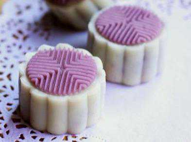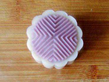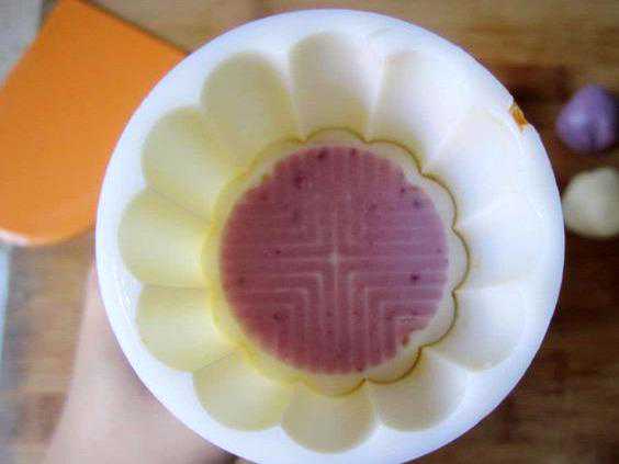 步骤6:取一点点步骤3的紫色面团压入50g一个(10头)的月饼模具的花纹中作为配色