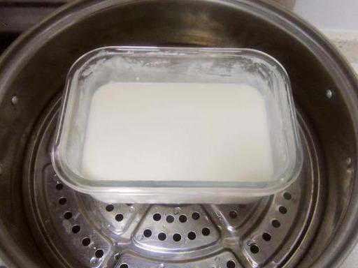 步骤2:糯米粉50g,粘米粉50g,玉米淀粉25g,低筋面粉25g,牛奶225g,炼乳2汤匙,猪油35g,糖50g混合,盖上盖子放入蒸锅中蒸25分钟后取出搅拌均匀,放凉至不烫手后揉捏成团。