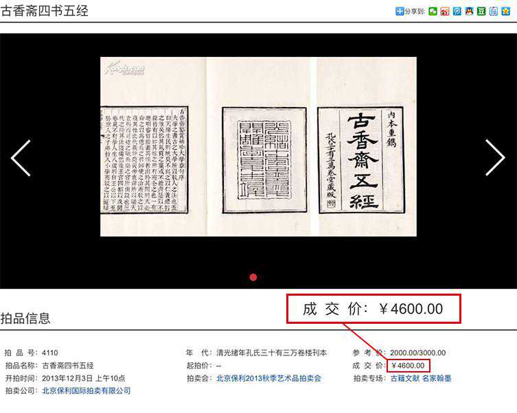 只此一套的皇家版《古香斋四书五经》如此珍贵,它是后世收藏家的心头好。就连光绪年间的复刻本也被拍卖至4600元,极具收藏潜力。