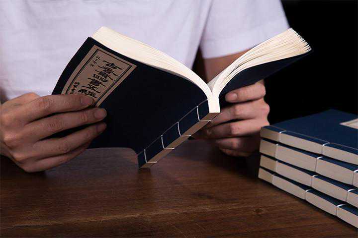 遵循传统线装书的装帧工艺,20道工序将筒子页手工线装成册,每个书角处都包裹着淡黄色绢,更抗磨损。