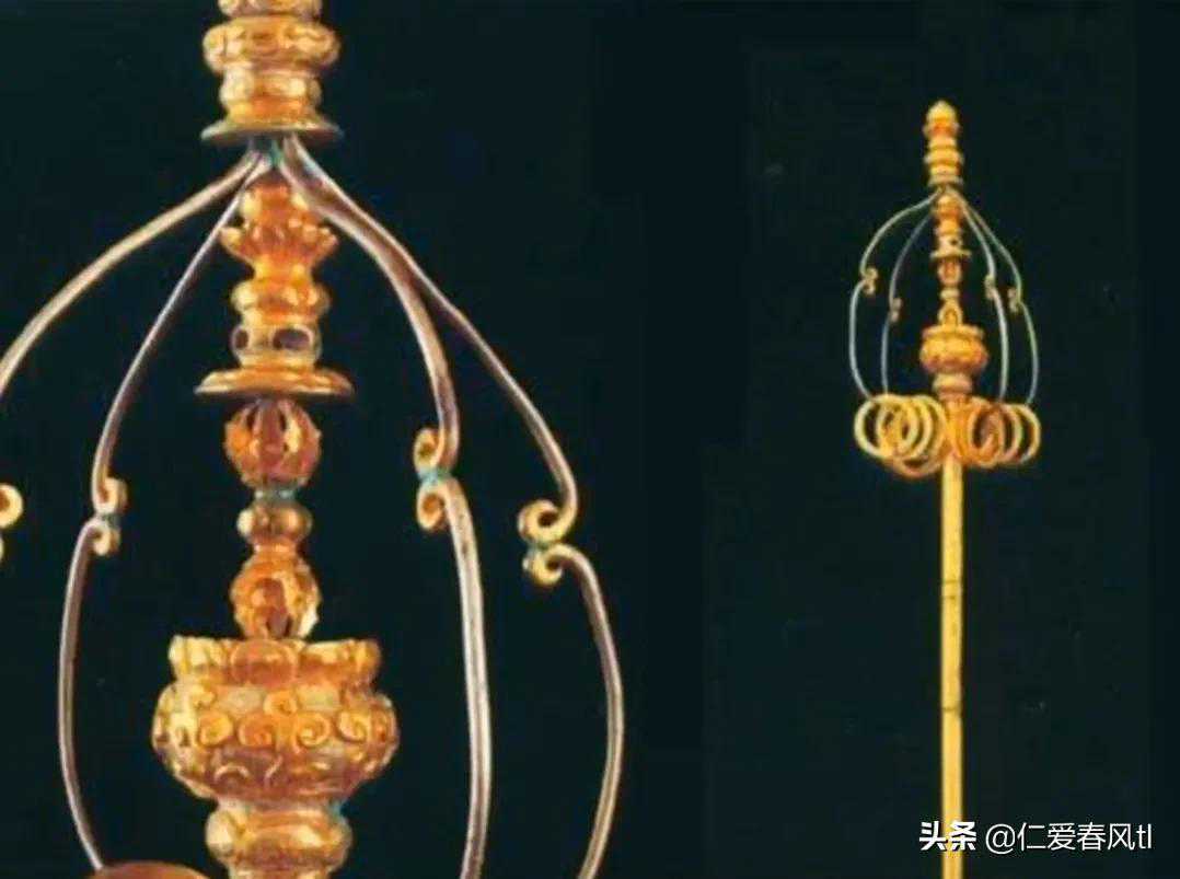 这件鎏金迎真身银金花四股十二环锡仗正是众多珍宝中的一件,全长一百九十六点五厘米。通体白银制成的表面金光闪闪,它是由唐僖宗为迎接佛指示的佛家舍利子专门打造的。
