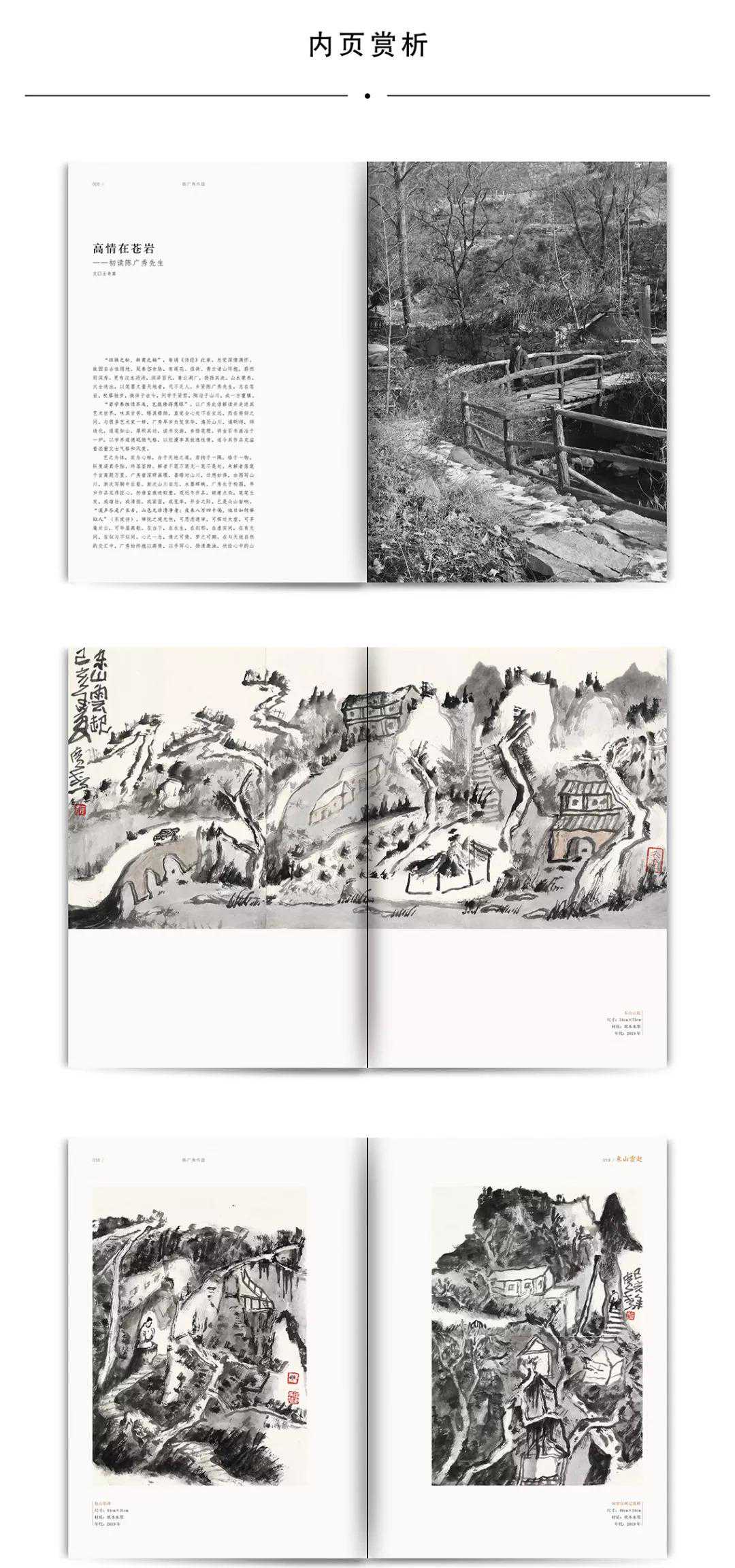 山水画讲究生发,过于著相著空皆非山水理境的正宗,熟而生之,生而熟之;实而虚之,虚之实之;破而立之,立而破之;浓而淡之,淡而浓之;幽而显之,显而幽之;疏而密之,密而疏之;艳而冷之,冷而艳之;躁而枯之,枯而躁之;秀而雄之,雄而秀之;厚而薄之,薄而厚之;野而雅之,雅而野之;滑而涩之,涩而滑之;刚而柔之,柔而刚之;墨而水之,水而墨之……慢慢比对,陈广秀纵横有象山水画的禅理相辅相成,独饶机锋,气韵生动——山水、人物、树石、禽鸟、亭榭、屋舍,不舍四季,琴瑟天籁。所以,有禅意的画面往往增添一楼品味的味道,是文心的重要补充。