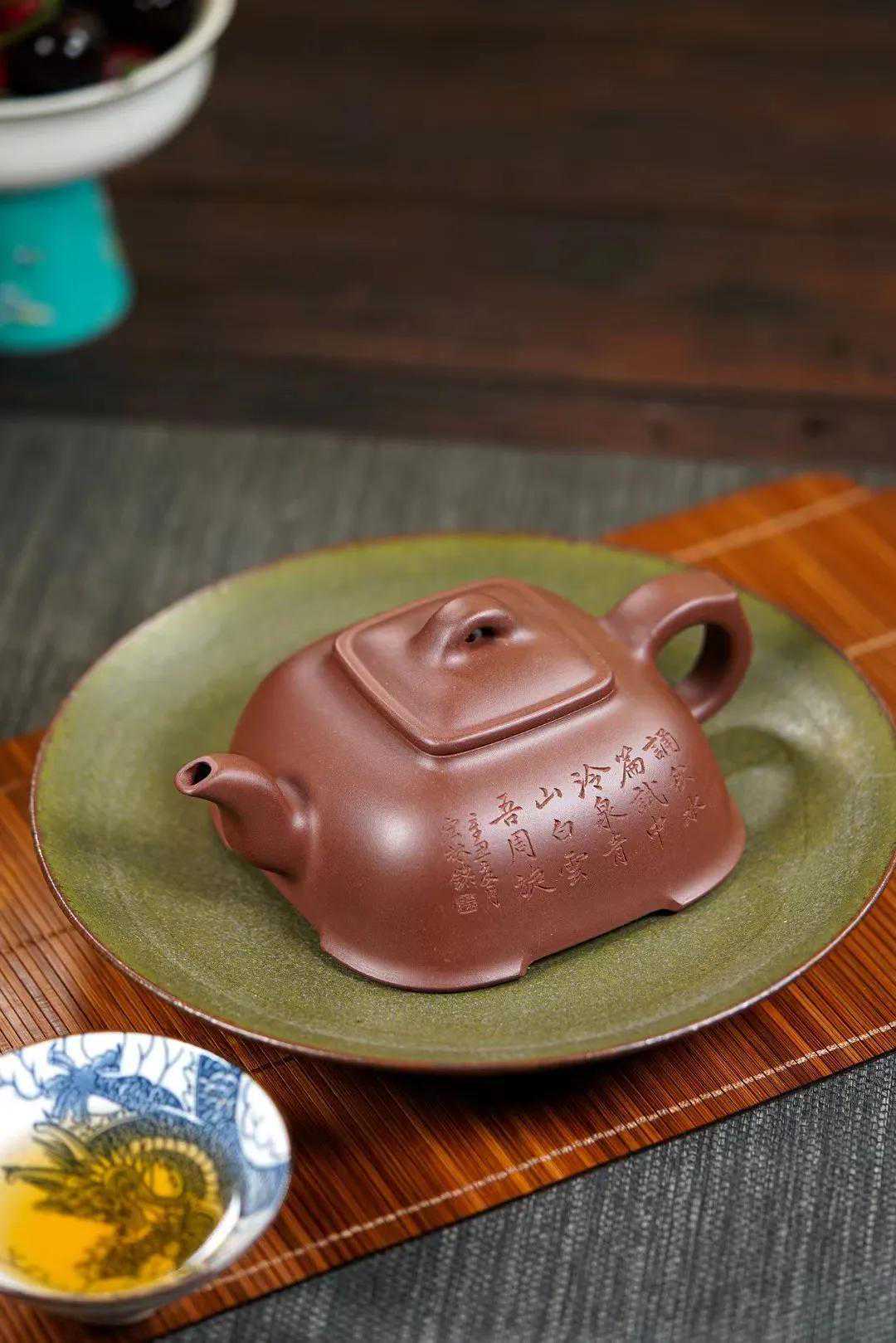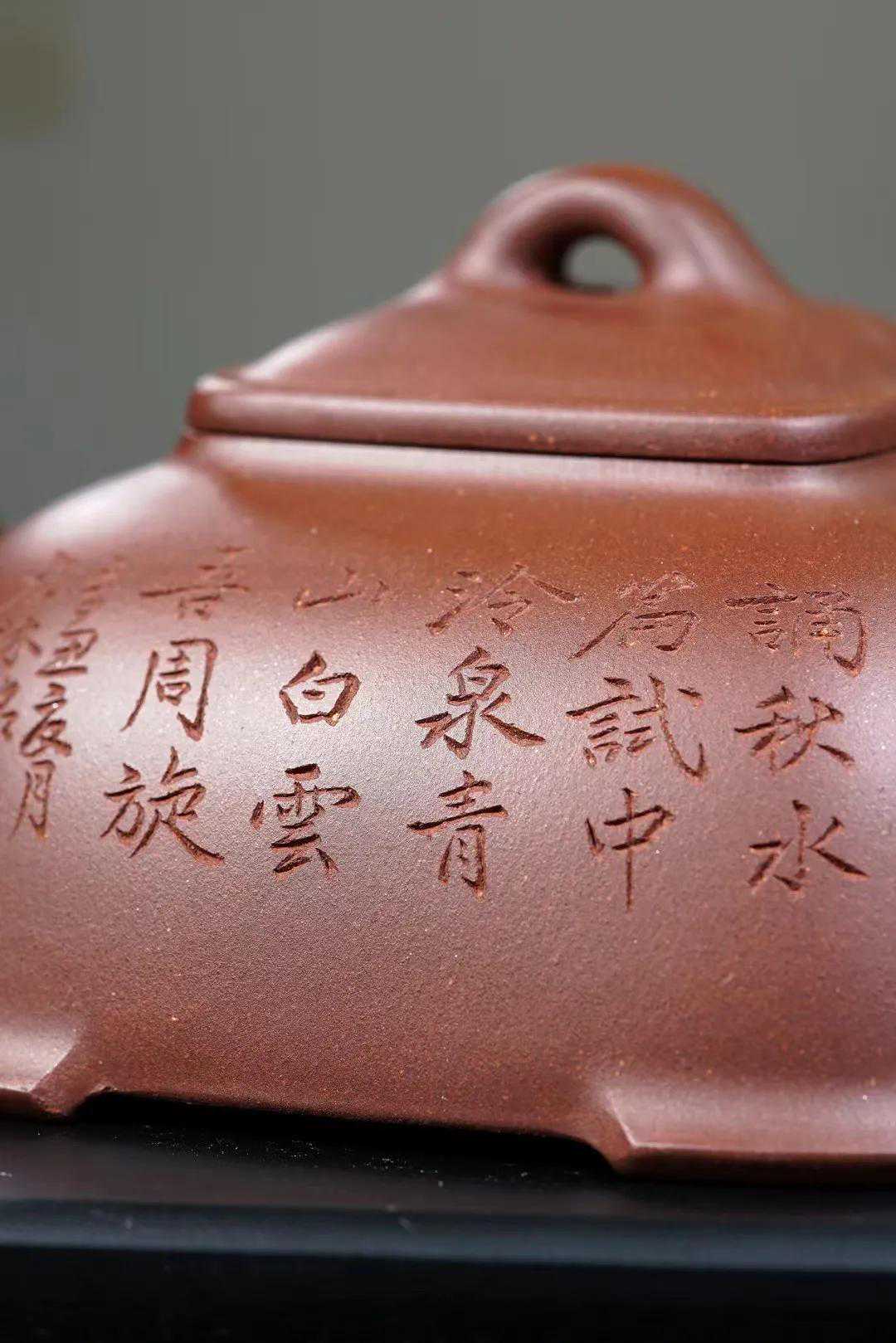 它的底方肩浑,下宽上收,稳重而雅致,四方足托空壶体,严谨而不失古韵。壶钮比较有特色,钮内孔圆,外呈三瓣弧形,方便拿捏,壶身和流、把皆为方形,结构严谨,线条挺括,清晰分明拱形桥钮,结构严谨