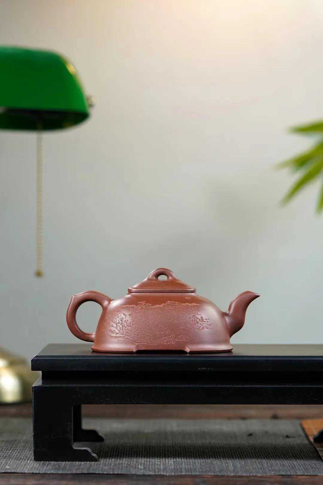 弧菱四方,原矿底槽清,250cc,何卫枫作,陈宏林刻绘,弧菱壶也叫四方弧菱,它有四个面,并且是混方壶,造型优雅、做工精致,在传统中创出新意,作品古朴典雅,端庄大方,传统功力扎实,艺术风格体现淋漓尽致