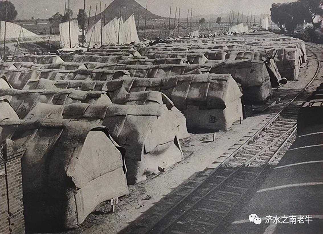 民国时期华山脚下小清河中的帆影及码头上堆积如山的盐垛(历史照片)