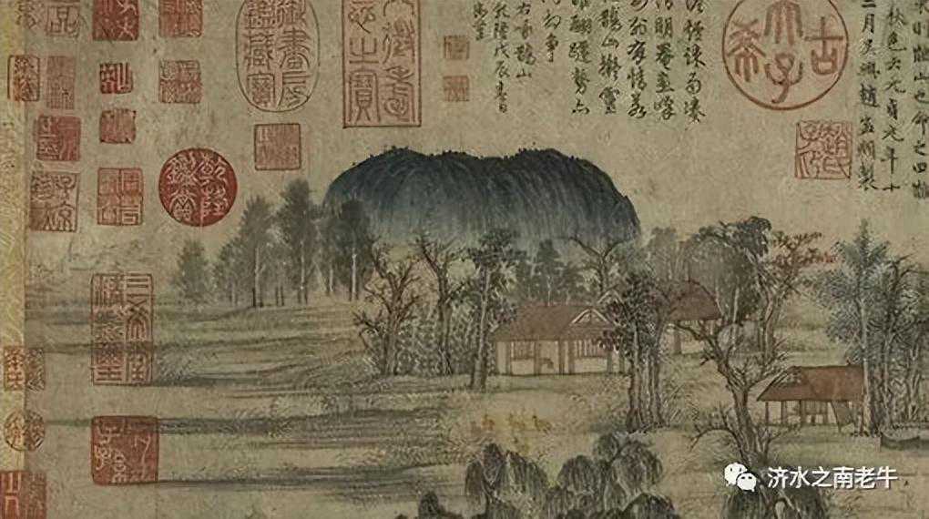 乾隆大爱先祖传下来的这个宝物,他不但亲笔题写大字标题于引首,还在此画空白处加盖了许多枚玉玺并题写了九则跋,从此该画被列入御藏目录《石渠宝笈初编》。更为有趣的是,乾隆十三年(1748)他来山东巡狩至济南后,目睹鹊华秀色,想起了此画,遂派人快马回京,从御府中取来画卷,按图索骥,与现实场景进行比对,并发现了赵氏在画上题跋中所谓华不注“其东侧为鹊山也”是弄反了方向。末代皇帝溥仪也在画上加盖了玉玺。1949年,蒋介石政府将这幅价值连城的名画带到了台湾,现藏于台北故宫博物院。