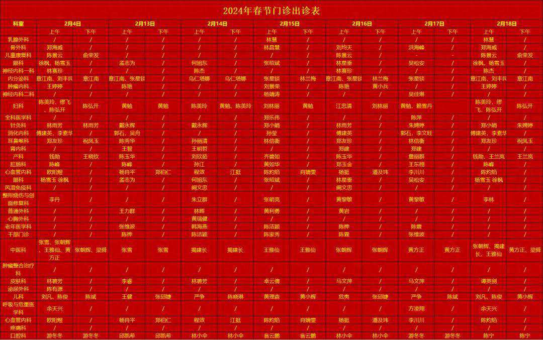 根据国务院节假日放假通知精神,结合医院实际情况,福建省福州肺科医院2024年春节期间,医院工作安排如下: