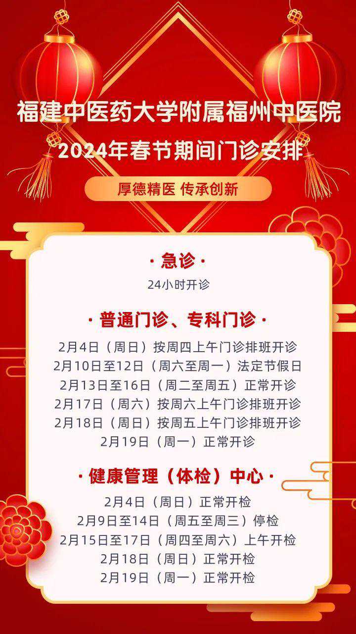 根据国家法定节假日安排,现将福州市第二总医院2024年春节放假时间及假期门诊安排通知如下: