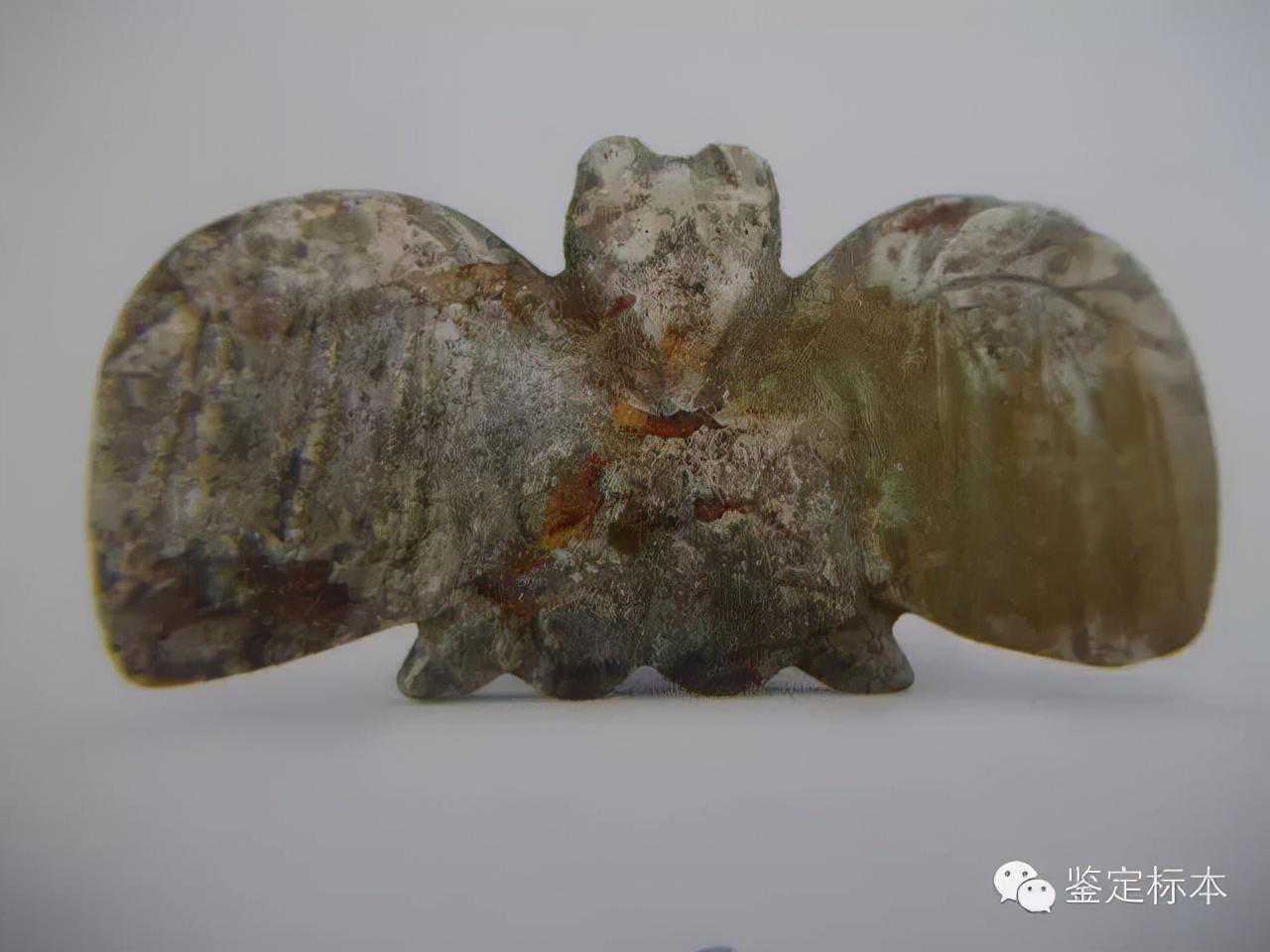 蠟質光,油潤度高,油潤從內部發出來,特別的厚重,厚重的光澤也來自於不平的表面造成的散光,散光分幾重,油潤而特別厚重,這種厚重的光澤不能仿製,只能依靠歲月的積累!!!這正是玉器複雜的光澤表現之一,這種特性也能幫助我們確定玉鷹的年代,光澤的複雜性是對一個鑒定家鑒定能力的挑戰。
