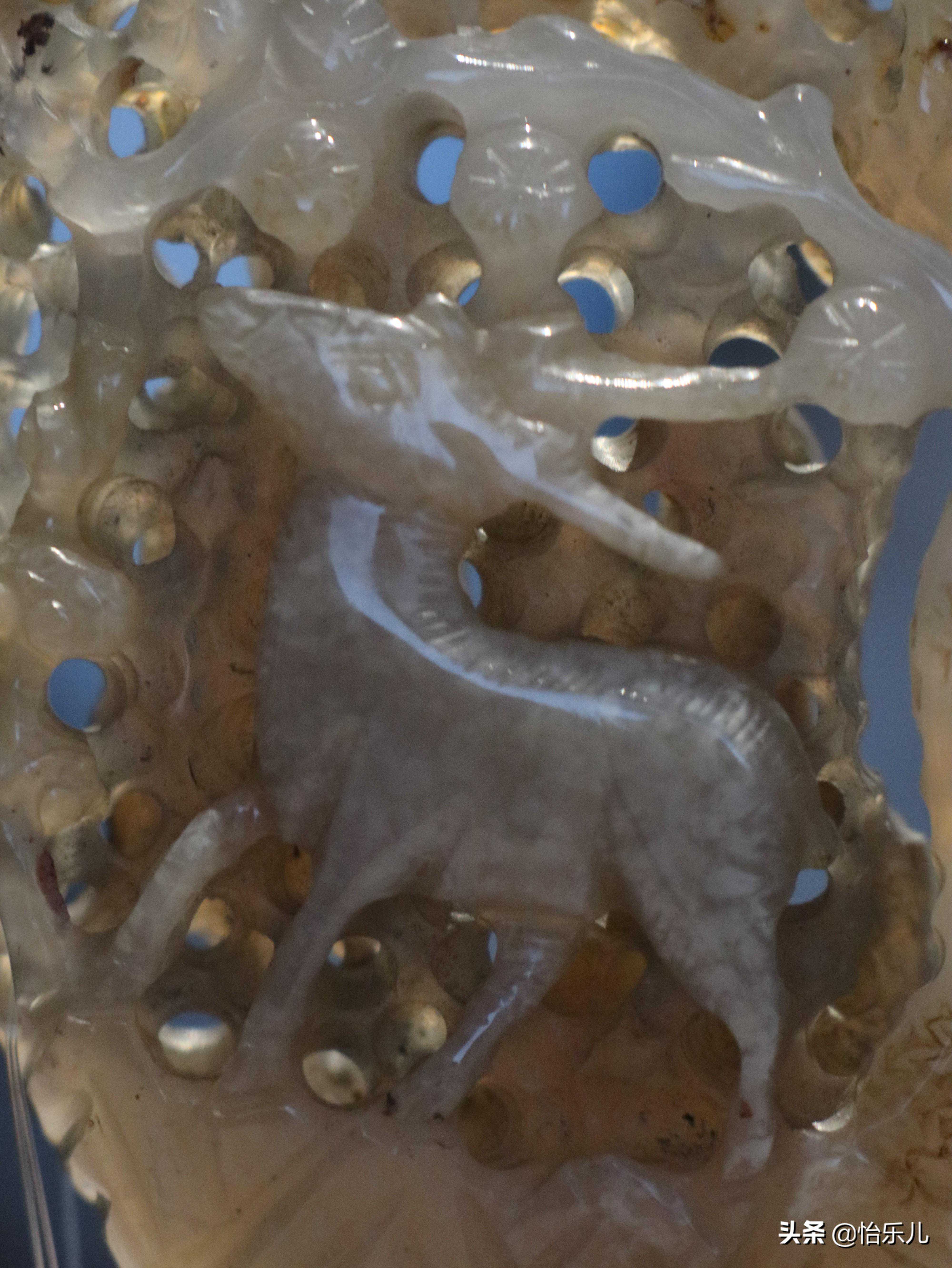 这件玛瑙饰为不规则形,是作者根据玛瑙的不同玉髓纹饰,因材施艺,采用镂雕、高浮雕、透雕等多种技法雕琢而成。