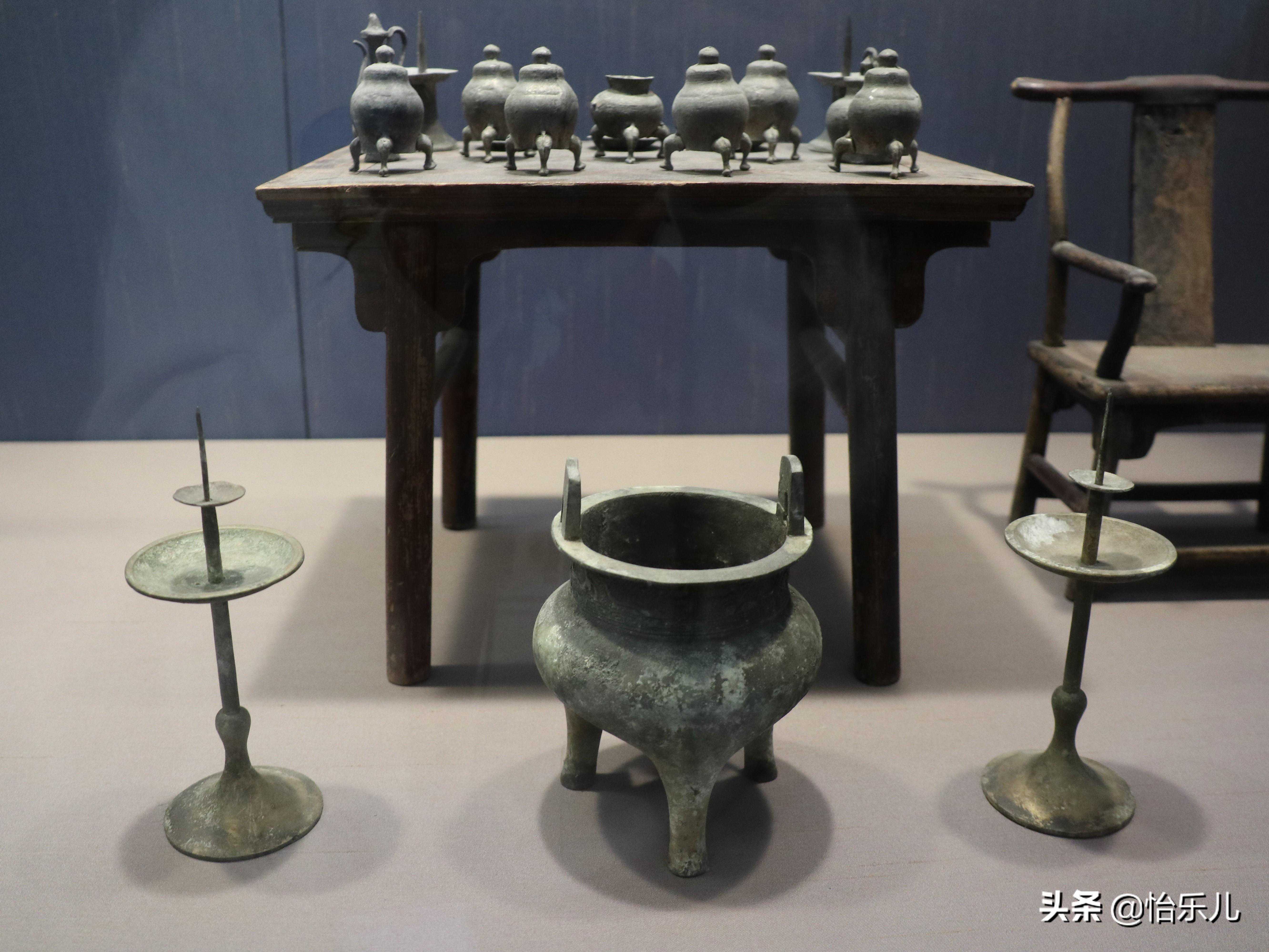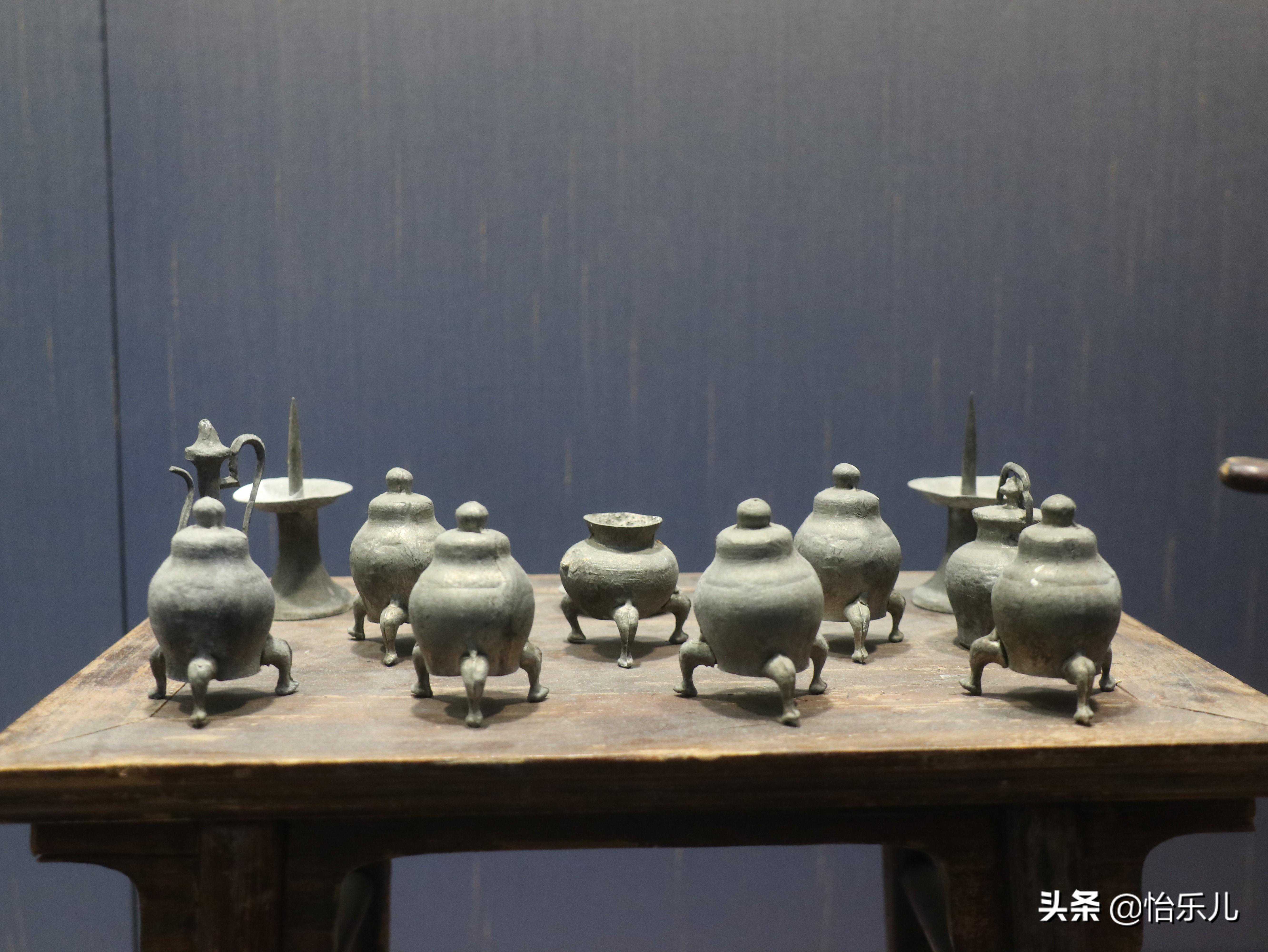 小木桌子上还有一套锡明器,供桌前摆着小香炉和一对烛台,但都只有一点几厘米高,很精致。