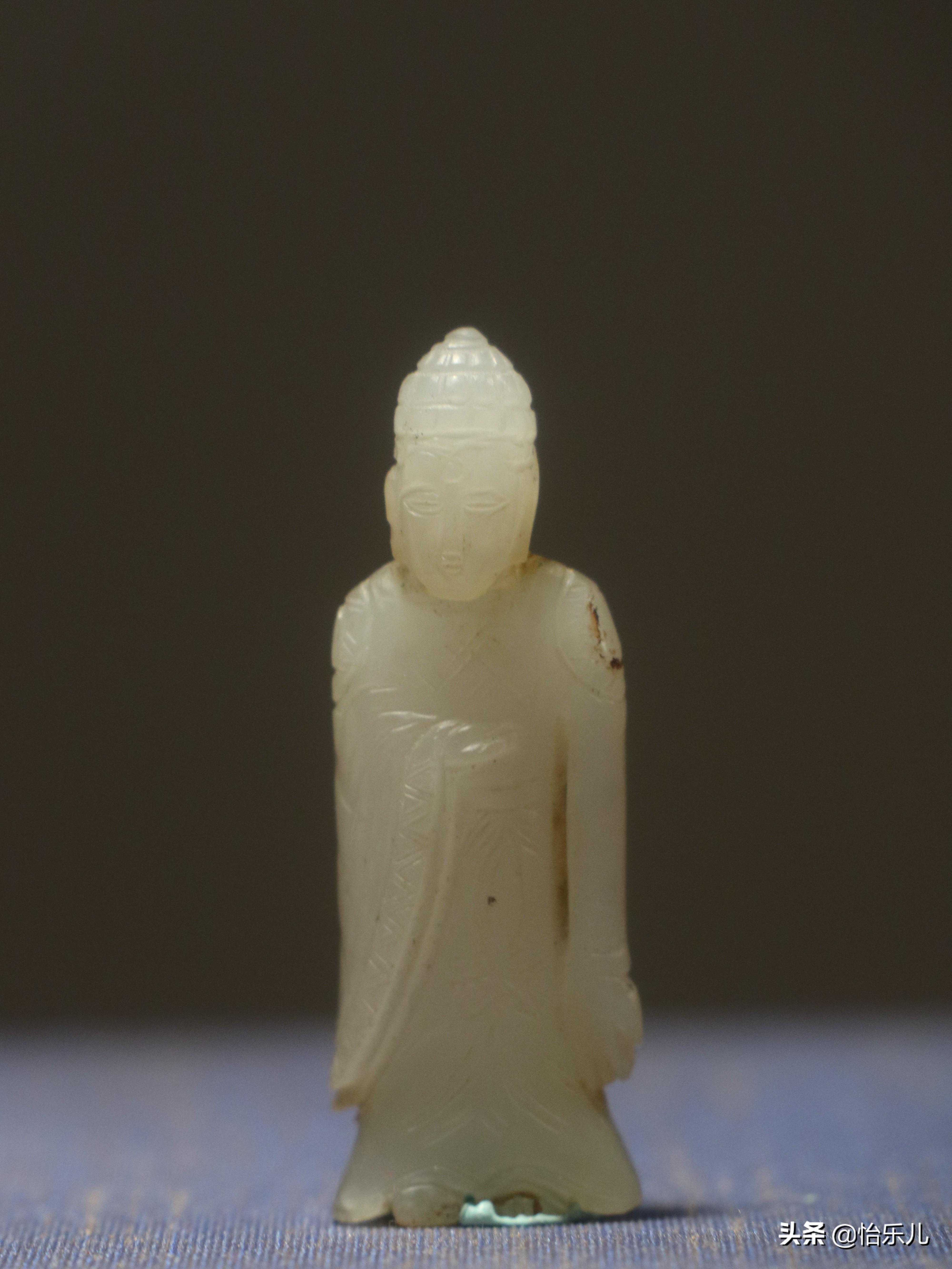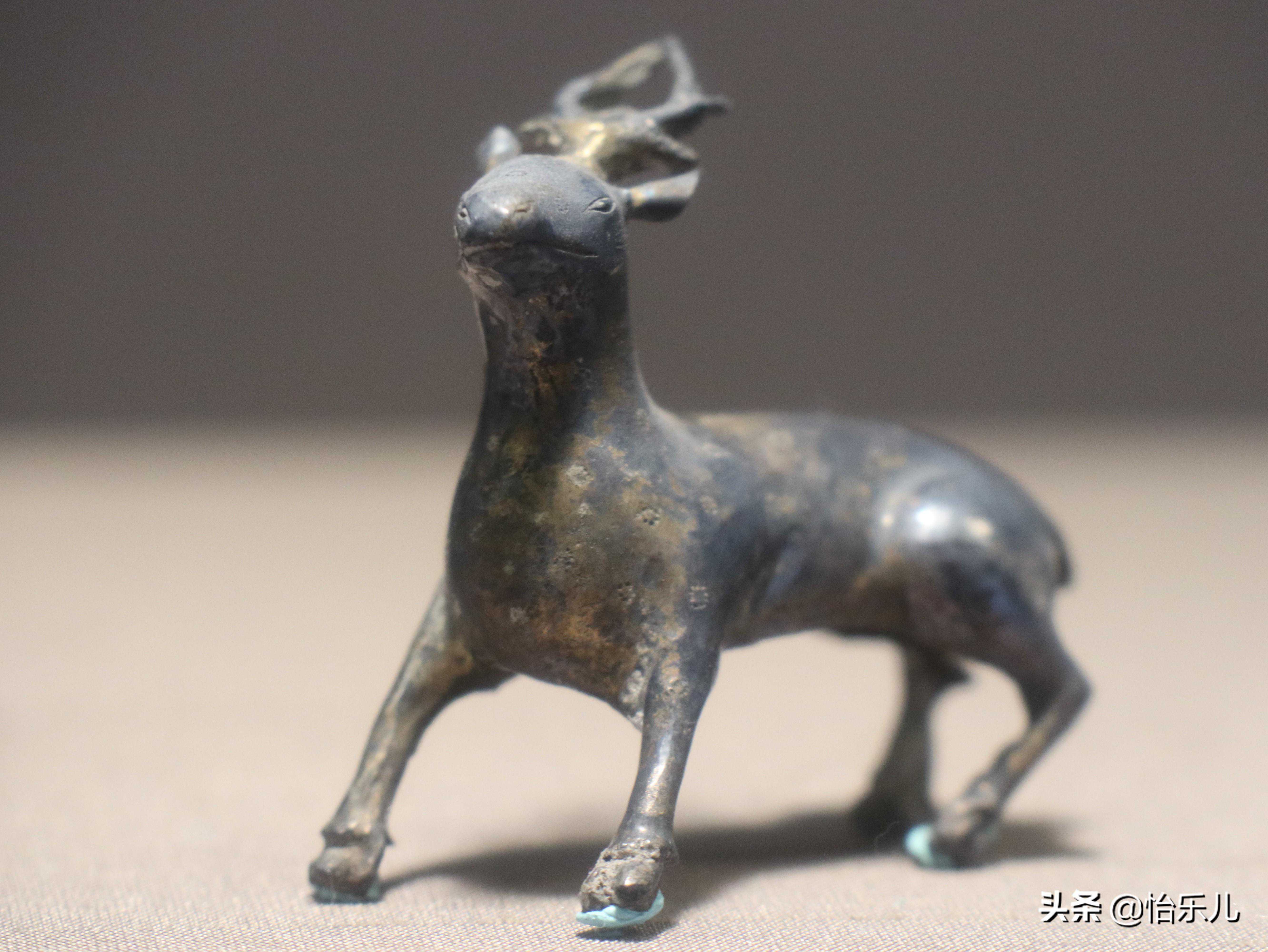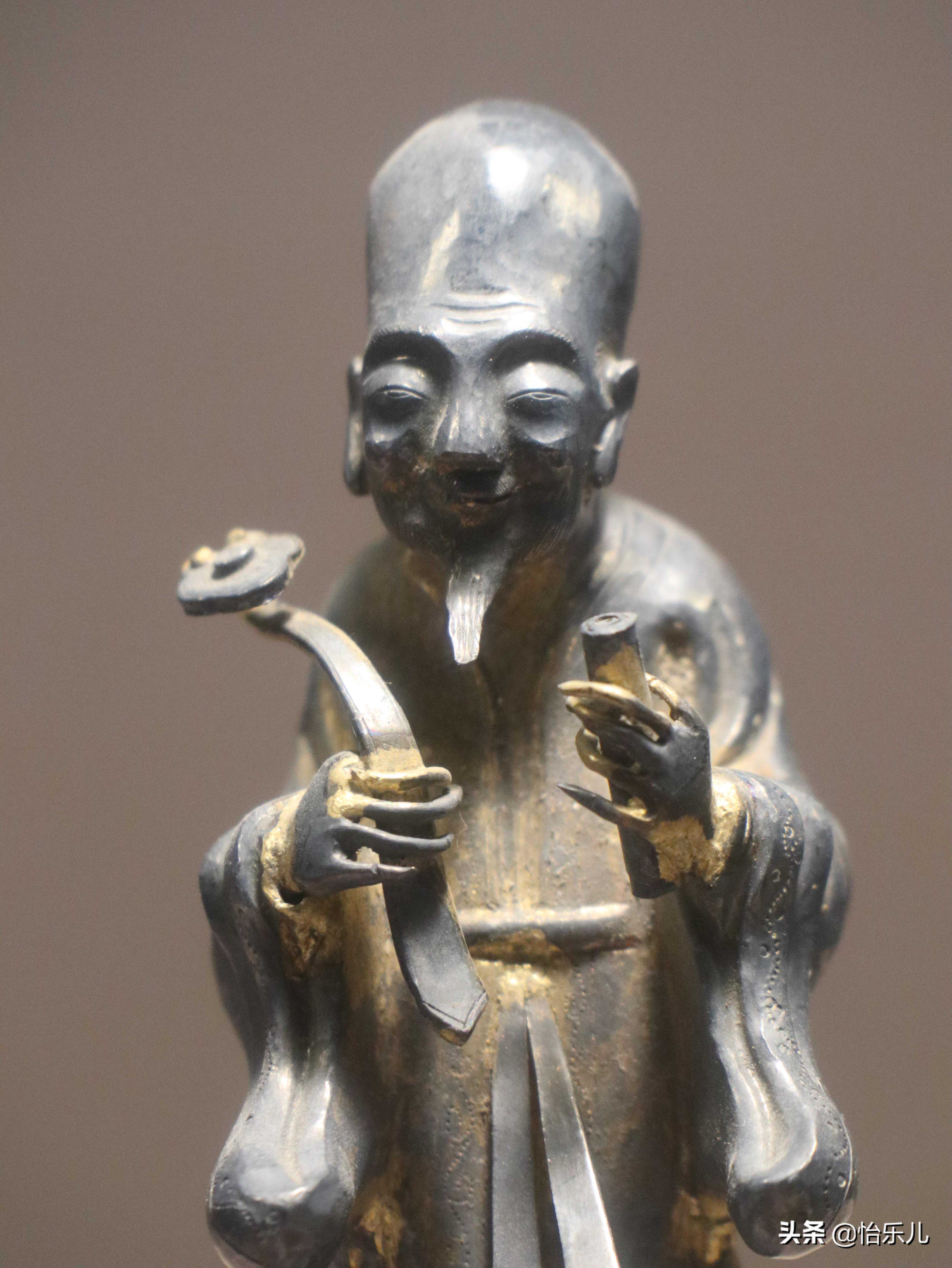 出土时立于一面四乳四兽铜镜上。“福星”居中间,手持如意,左右分列鹤、鹿,寓意“寿”与“禄”。