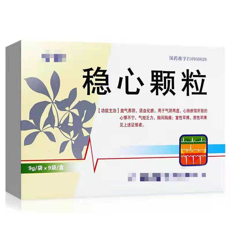 稳心颗粒的主要成分有党参、黄精、三七及琥珀等,其中党参是君药,能养血安神、补中益气,黄精属臣药,健脾、益肾、润肺、补气养阴,三七及琥珀是佐药,镇静安神、活血化瘀;稳心颗粒主要适用于因为心脉瘀阻、气阴两虚所致的气短乏力,心悸不宁,胸闷,胸痛等症状。