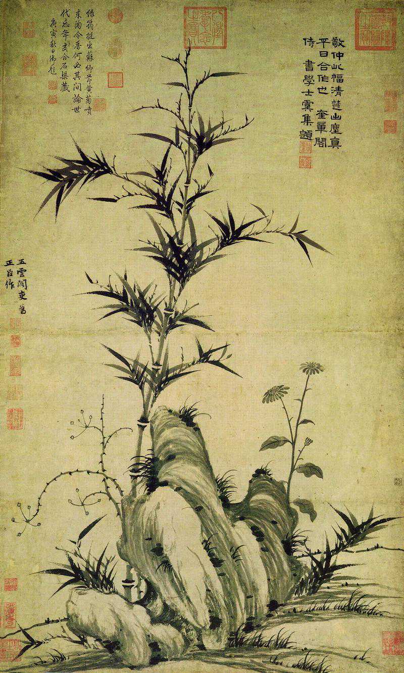 王蒙,生年不详,卒于1385年,字叔明,吴兴(今浙江湖州)人,赵孟烦外孙。元末官理问,弃官后隐居临平(今浙江余杭)黄鹤山,自号黄鹤山樵。明洪武初年出任泰安知州,因胡惟庸案受牵连,死于狱中。工诗文书画,尤擅画山水,师法董巨、赵孟烦而有发展变化,自具风格,为“元四家”之一,其山水画风对明清山水画创作具有很大的影响。传世作品有《林泉清集图》《春山读书图》《丹山瀛海图》《竹石图》等。图绘丛竹和坡石,竹子枝叶疏落,坡石皴笔短促而苍劲。疏竹布于左上方,坡石居下,中间的空白处以楷书诗题相连,起到了贯穿气息、参与构图的作用,体现出元代文人画所强调的诗书画相结合的形式。此图为王蒙传世作品中较早的一件。