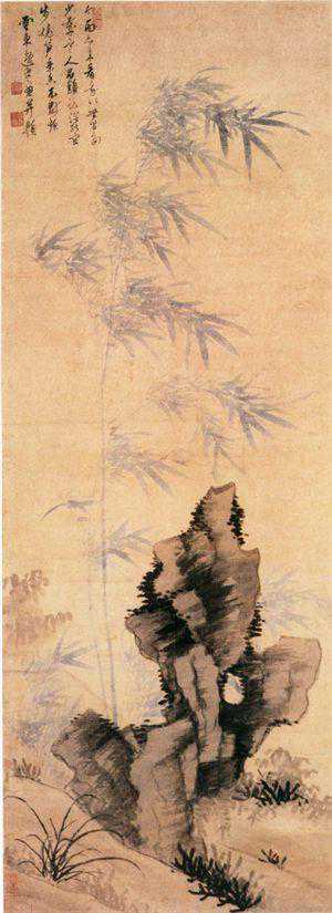 此图画山坡上湖石耸立,石后翠竹两竿迎风挺立,石下兰草丛生。湖石用笔豪放简劲,横皴平点,墨色浓淡相宜。竹以花青色淡写,笔力劲挺秀拔,有风姿绰约之感,得淡雅清逸之致