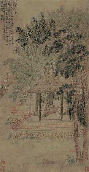 沈贞,生于1400年,卒年不详,明代画家。一名贞吉,号南齐、陶然道人,长洲(今江苏苏州)人。工唐律,善绘事,山水取法董源,略具烟林清旷、平淡天真之趣。此画山峰耸立,山岩脚下,丛竹苍翠,清溪湍流,杂树、山房、水榭、庭院错落其间,竹房内有人对坐闲谈,颇得清幽之趣。沈贞师法董源,又取元诸家之长,山水精妙,直逼宋人。此图笔墨工整缜密、清新秀逸。
