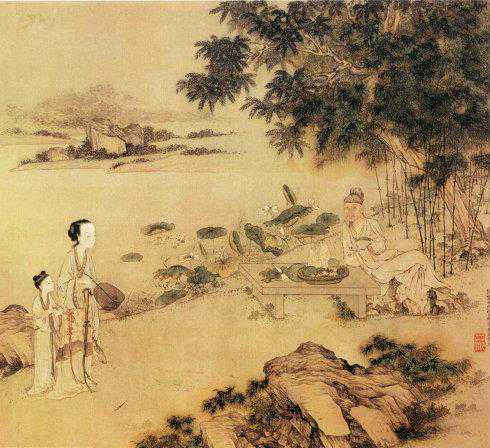 此图写唐杜甫五律《陪诸贵公子丈八沟携妓纳凉晚际遇雨》二首之一的诗意。原诗中有“竹深留客处,荷净纳凉时。公子调冰水,佳人雪藕丝”两联句,图中景物与诗意相吻合。笔墨工细,人物动态悠闲自在,衣褶用浓墨钩勒,略似折芦描法,笔势流畅;布景简洁,设色雅淡。山石用小斧劈皴,锋楞多姿,墨色富有层次,别具一格。