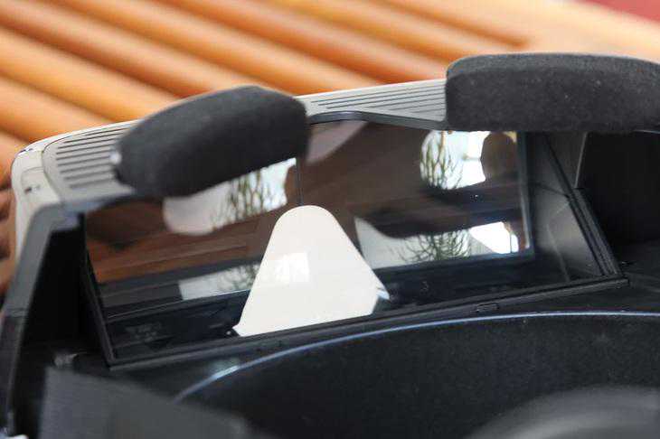 从头显的后方可以看到,内部使用了一块斜45度的透镜,这也是投影手机图像最关键的一个元件。