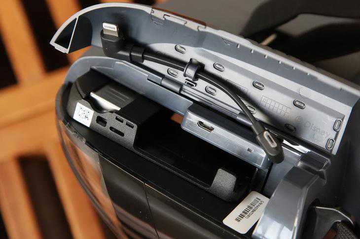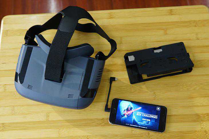 头显的左侧采用了翻盖式设计,可以看到迪士尼的标志。手机则是放置在头显上方的隐藏卡槽当中,这个设计非常巧妙,与头显的连接也很方便。