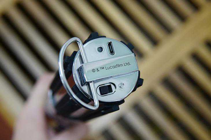 从一个小细节上,就可以看出联想在这款光剑控制器上花费的心血,控制器下方的拉环在移动时并没有松松垮垮的感觉,这也是官方对阻尼值有所要求,足可见其精细程度。在下方还可以找到卢卡斯影业的名字,经过认证的它,完全就是一款官方正版的产品。