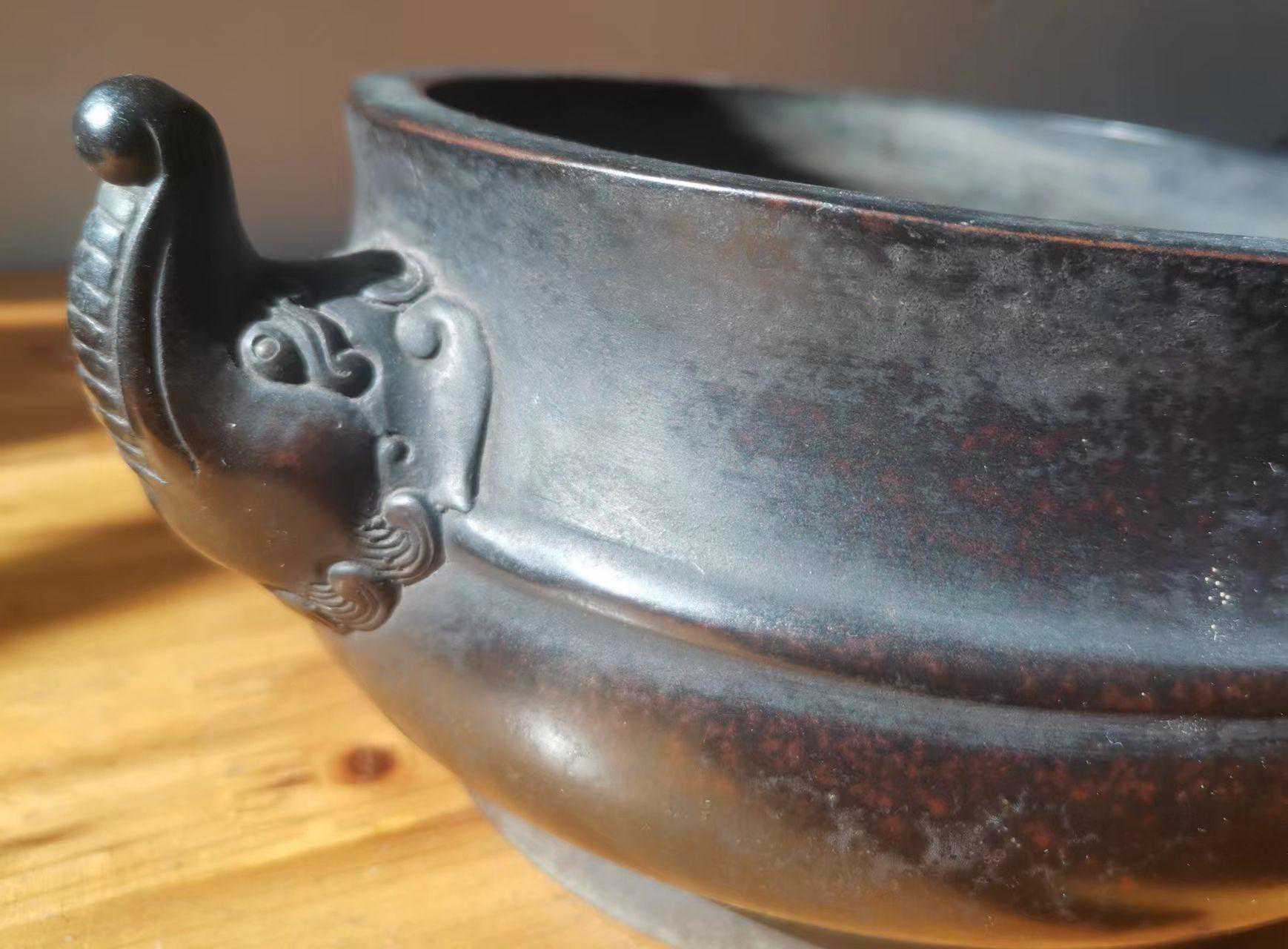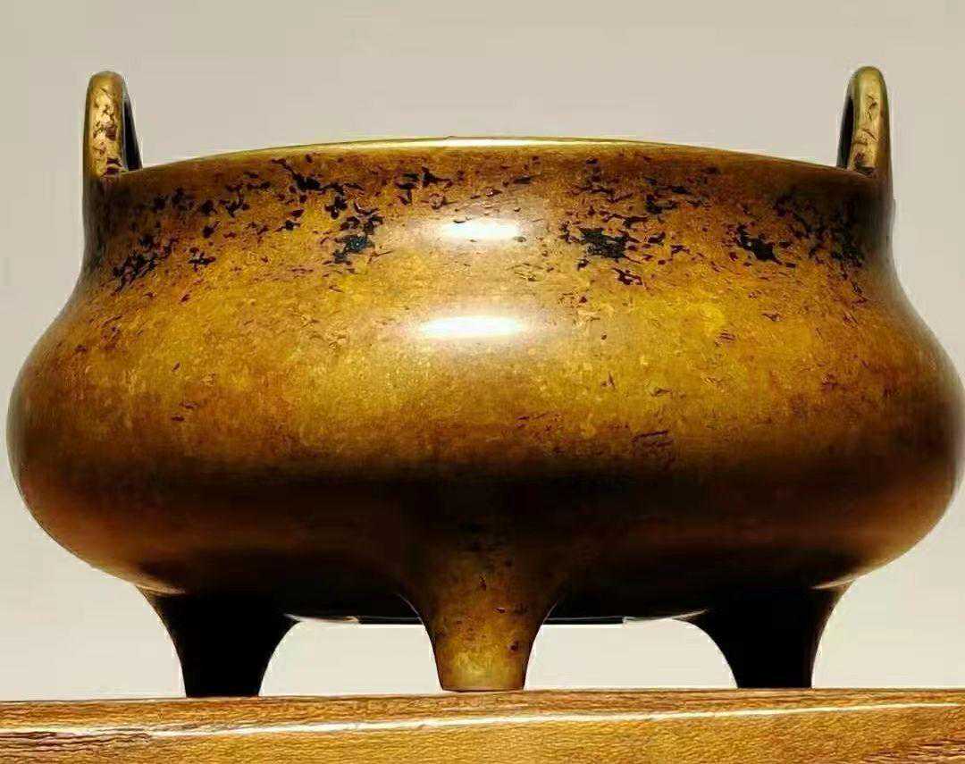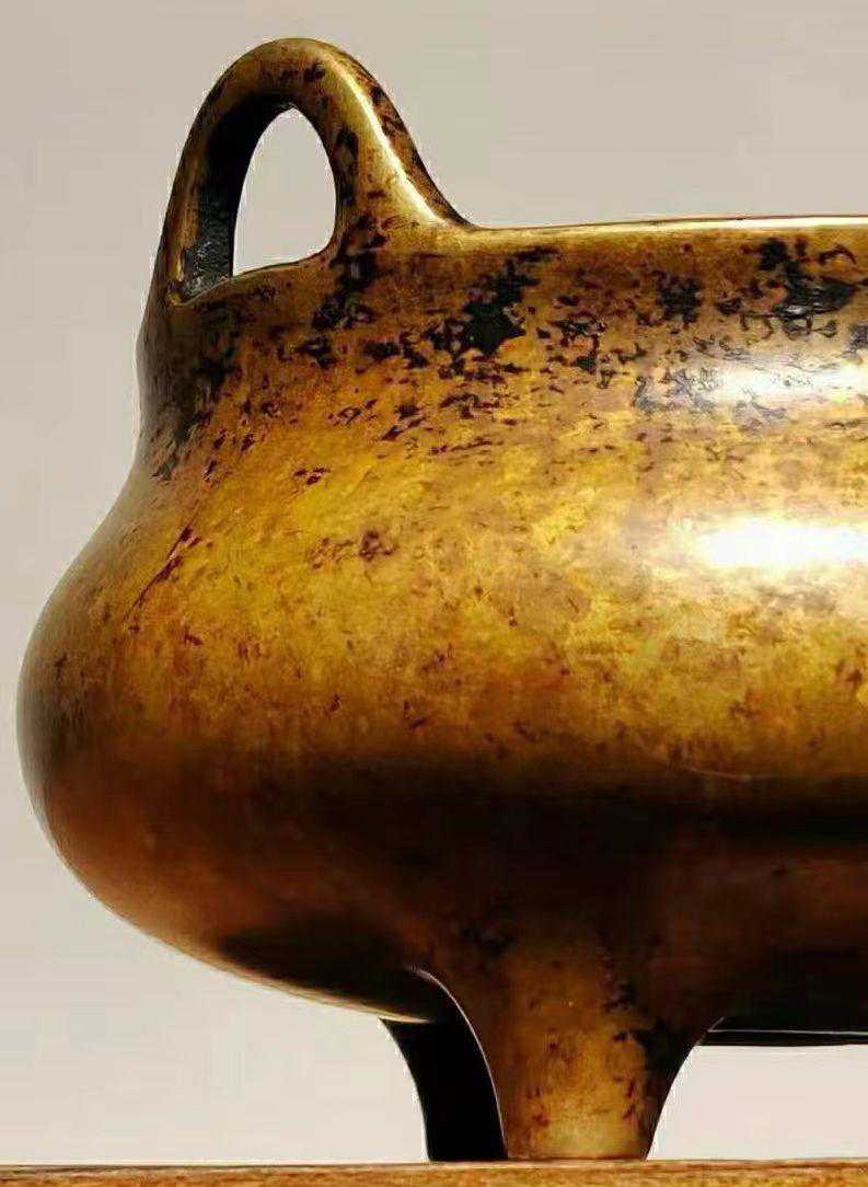 真品宣德炉包浆莹润,宝色内蕴,历久不变。“宣德炉”主要有五色最为藏家痴醉,分别为佛经纸色、栗壳色、茄皮色、棠梨色、紫褐色。以大小而言,宣德炉直径在8-12厘米最为常见,属于小号;直径在15厘米左右的炉是中号,数量比小号少;而直径大于20厘米的铜炉是大号,工艺精者稀见,收藏价值极高。(文/徽京玩家)