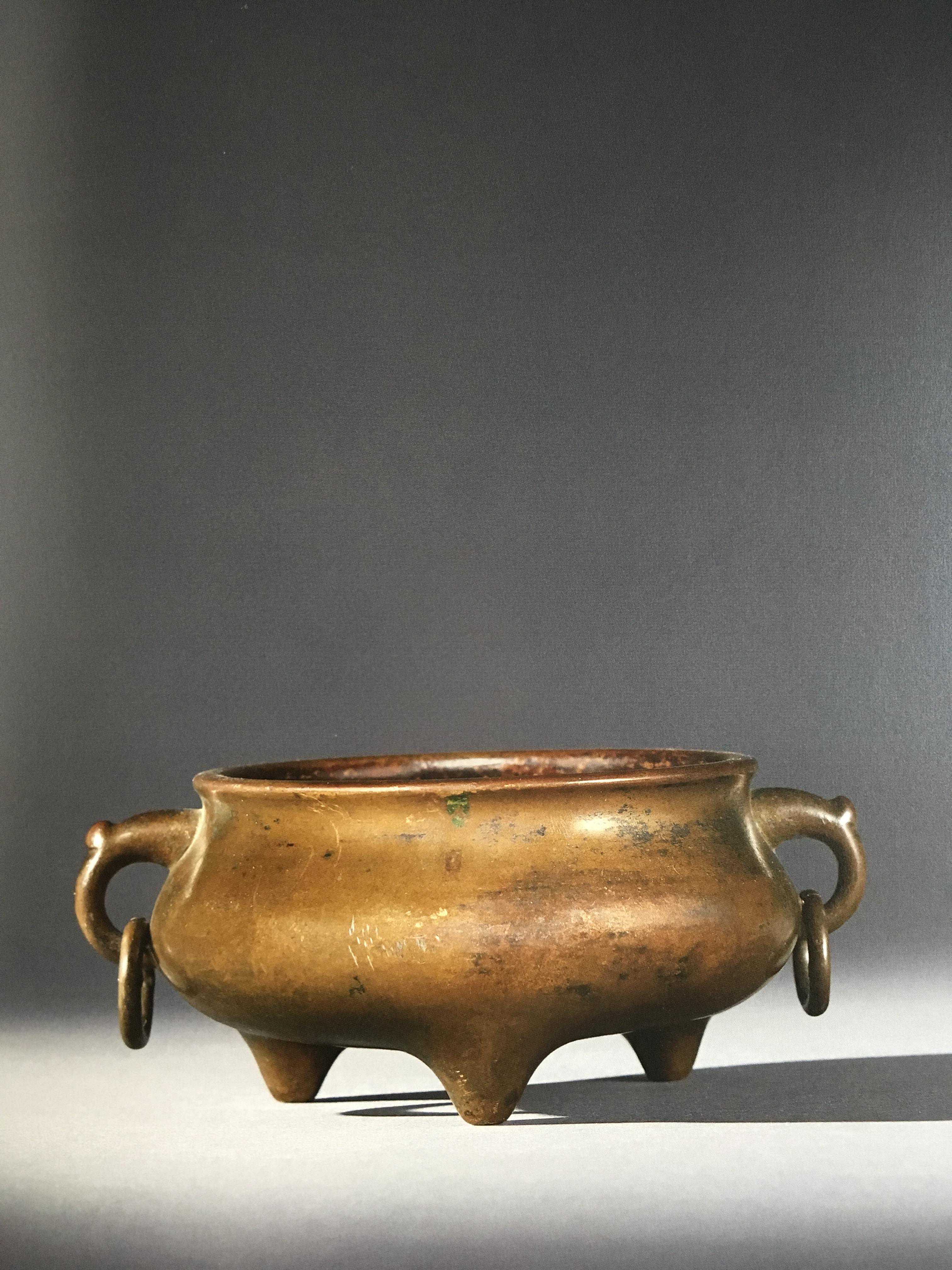 《宣炉小志》中曾经提到:塑身、无颈,斜下出垂鼓腹,缓收出底,承三乳足,高而外撇。炉身两侧塑连环圆耳,上肥下瘦,弯曲势收,穿以圆环,更显灵动可爱,这本书中也称其为琴炉,不知是否在古代文人雅士抚琴的时候身边也使用此类铜炉,目前笔者并没有找到古代书画作品有类似的刻画,故仅以文字形式表达希望未来能有更深入的了解与大家分享。