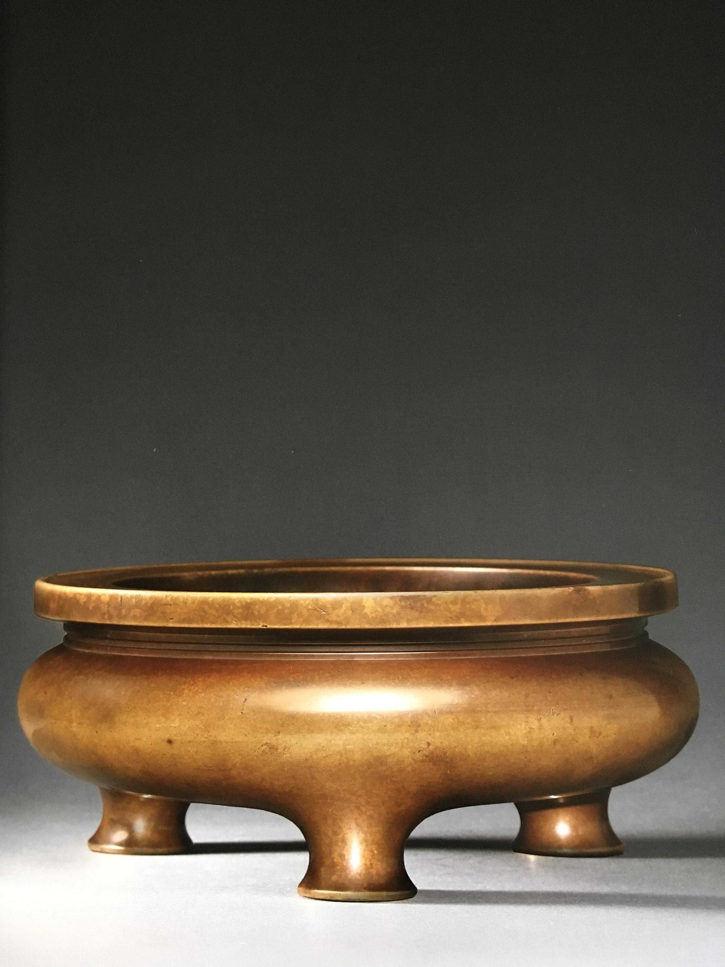 宣德炉的制作数量在历史上是有明确记载的,首批铸造的成品是3365个,其后又追加制造,总数一直达到18000个截止,其实,这里所谓的截止也仅仅只是在当时宫廷提供原料的情况下,而自此以后的宣德炉仿造、私铸问题成风,其后甚至在其底款上乃至于炉膛内的纹饰都有了更大发展,在炉底曾经有大量的私铸款识与官款有明确区别,包括冷刻技法也都有出现,也证明了当时文人对香炉的喜爱,以及对金石篆刻个人款识的一种追求,而除了私铸仿造品之外,这18000件宣德炉本年的炉也极大可能在明崇祯年间被送入宝源局熔炼铸钱,这也就说明了为什么今天故宫被认定的宣德本年的炉子那么少的一个原因,当然,这也仅仅只是笔者的一种推断,希望以后文博部门能给大家一个更准确的答案。