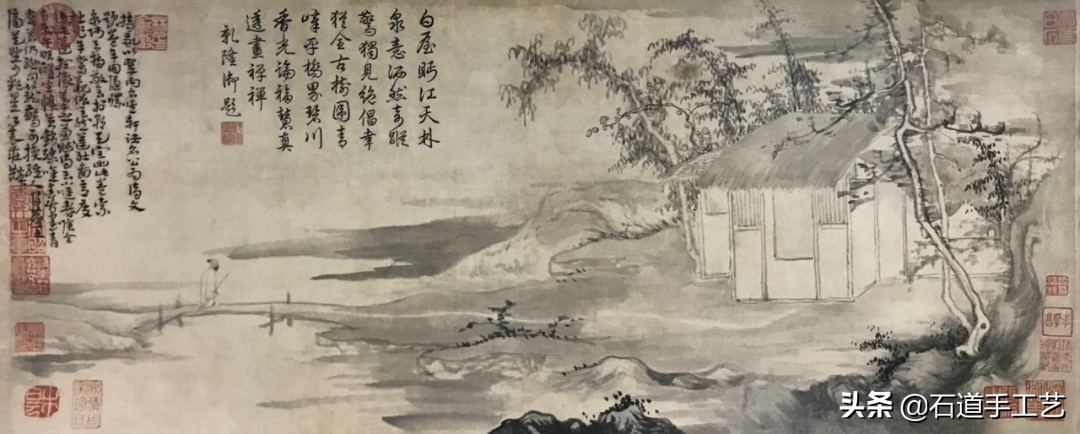 赵干(10世纪),江宁人。画善山水,为南唐李后主(李煜)画院学生。这卷写初冬江边渔作之景,全图以白粉弹雪,遂觉江天寒雪纷飞,将渔人艰辛作活情景描述殆尽。是目前传世作品中最早的一幅绢地山水人物并重之手卷画。