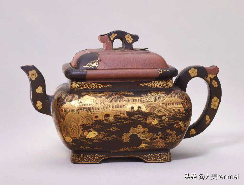 清宜兴窑紫砂黑漆描金彩绘方壶