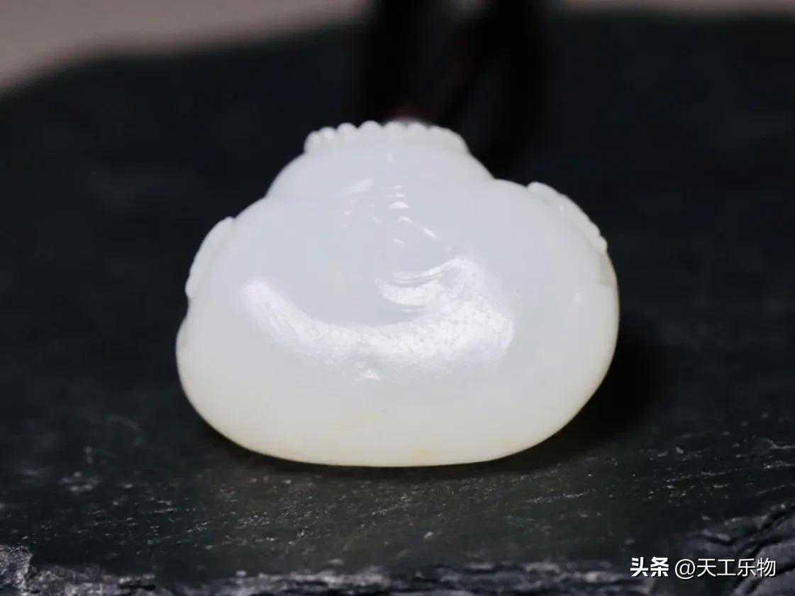 这件弥勒佛由一颗完整的和田小籽巧雕而成,原籽高白明亮,光感饱满,玉质高细高密,温润柔和。