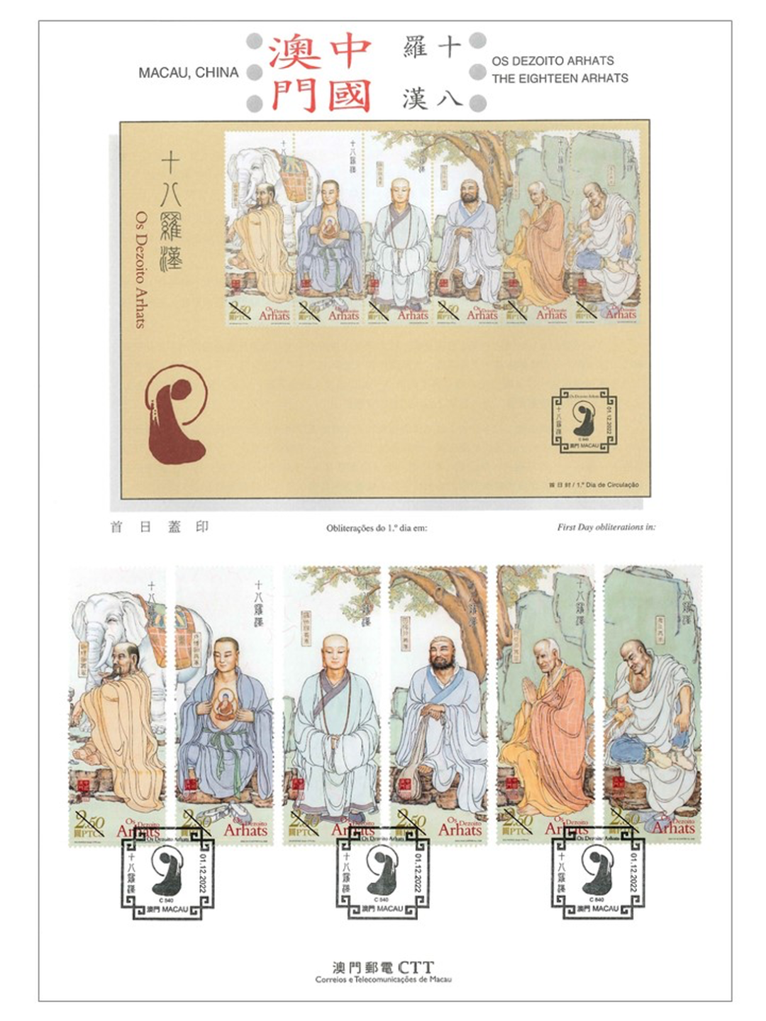澳门邮政局定于2022年12月1日发行《十八罗汉》邮票一套18枚,面值均为:2.50元。此套邮票采用传统工笔技法绘制十八罗汉金身,法相庄严。推出有小版张,并有长卷版形式礼盒。设计师由苏法融原作(邮电局修订)。