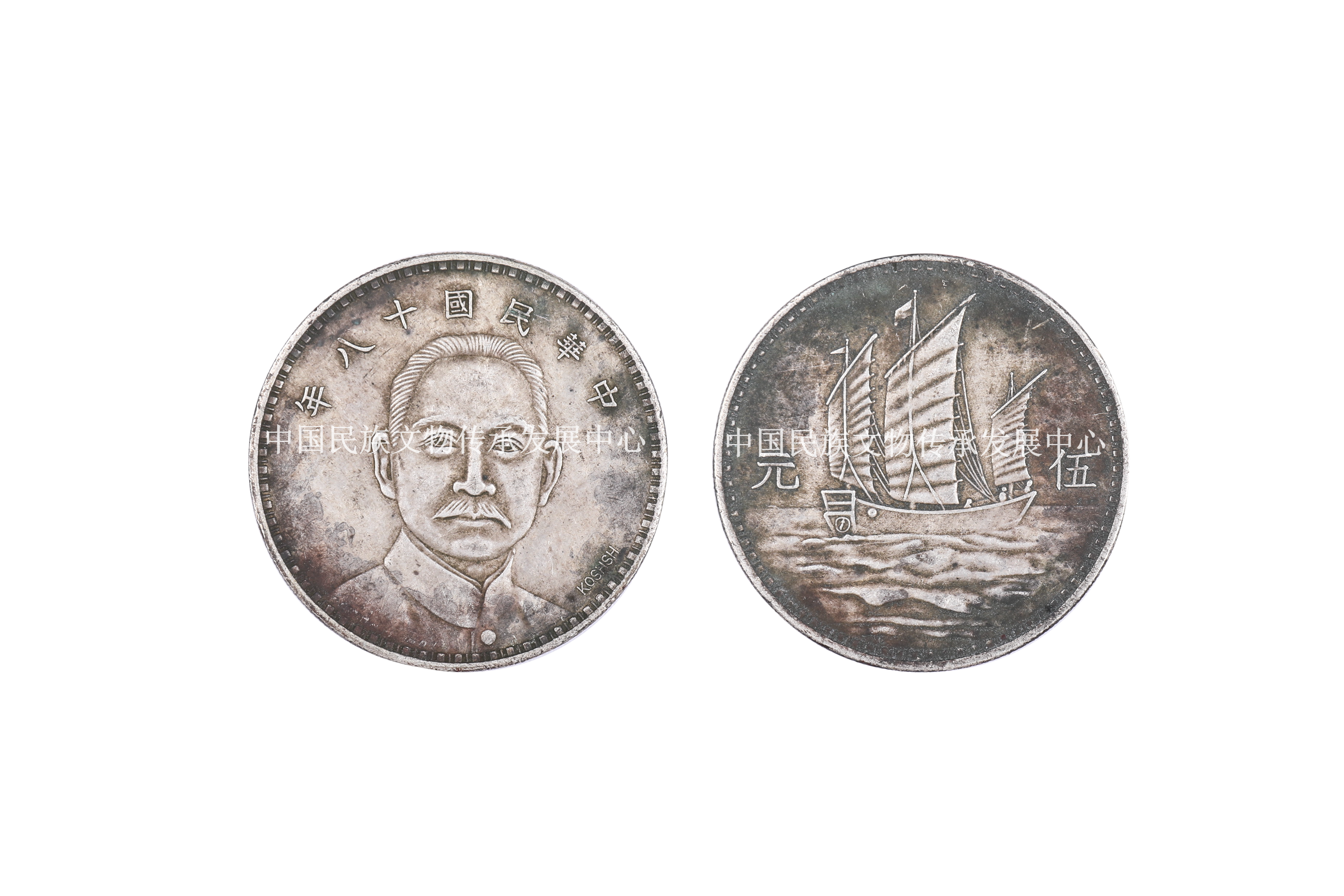 1929年(民国十八年),国民政府委托美国、意大利、英国、日本、奥地利等五国雕刻钢模,试铸孙中山正脸像伍圆银币,正面图案为孙中山先生西装正面像,孙氏头像上环刻铸造年份“中华民国十八年”字样,背面图案为三桅帆船驶于海上,帆船左、右刻面值“伍元”,这组样币因背面帆船上有三根桅杆,钱币收藏界俗称它们为“三帆船”币。