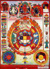 其左方为时轮金刚(十相自在图),令东、南、西、北、东南、西南、西北、东北、上、下等十方与年、月、日、时等时辰所组合的时空宇宙世界一切自在.其右方是防护一切凶煞、障碍.驱不祥的回遮咒轮。左下方的咒轮是一切音声的韵母,及缘起咒。作为增长善缘、福德、吸收日月天地间的精华。右下方的咒轮是回遮一切边缘,作依阴阳五行成九宫的遮止咒轮。