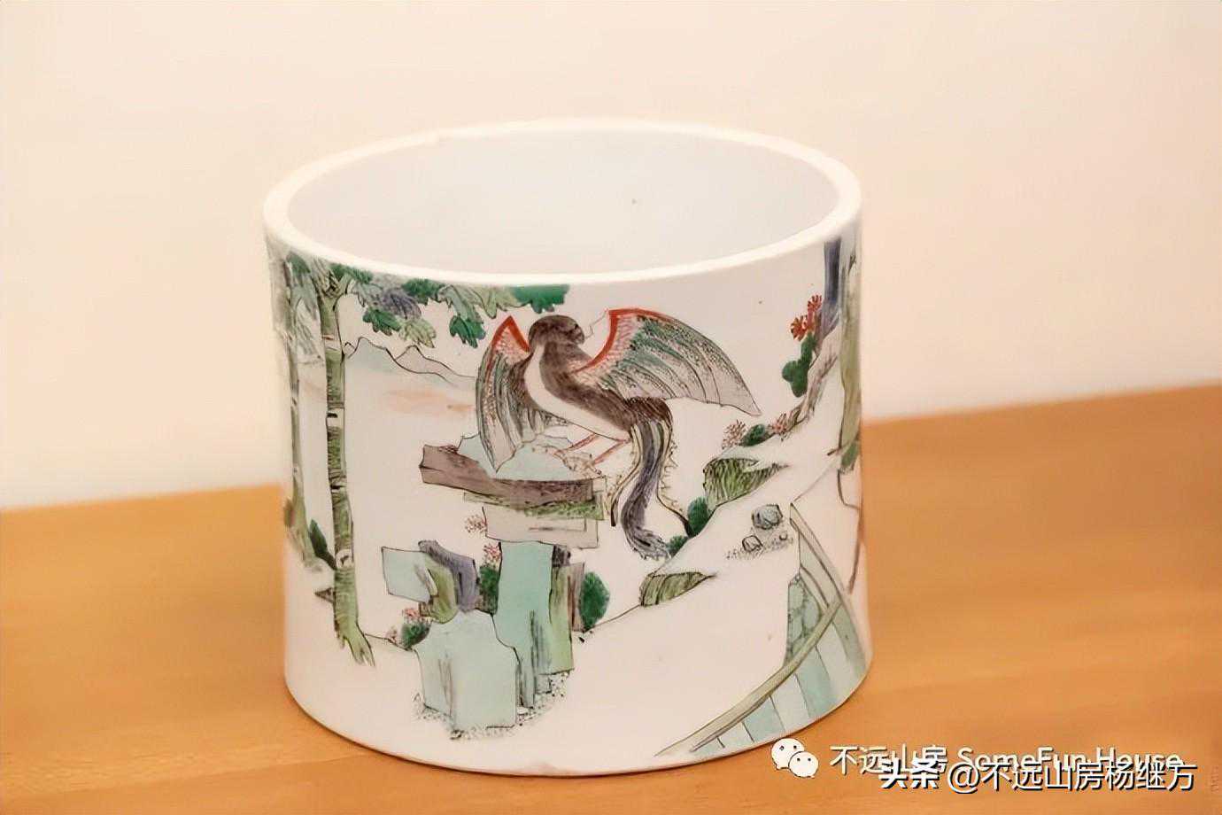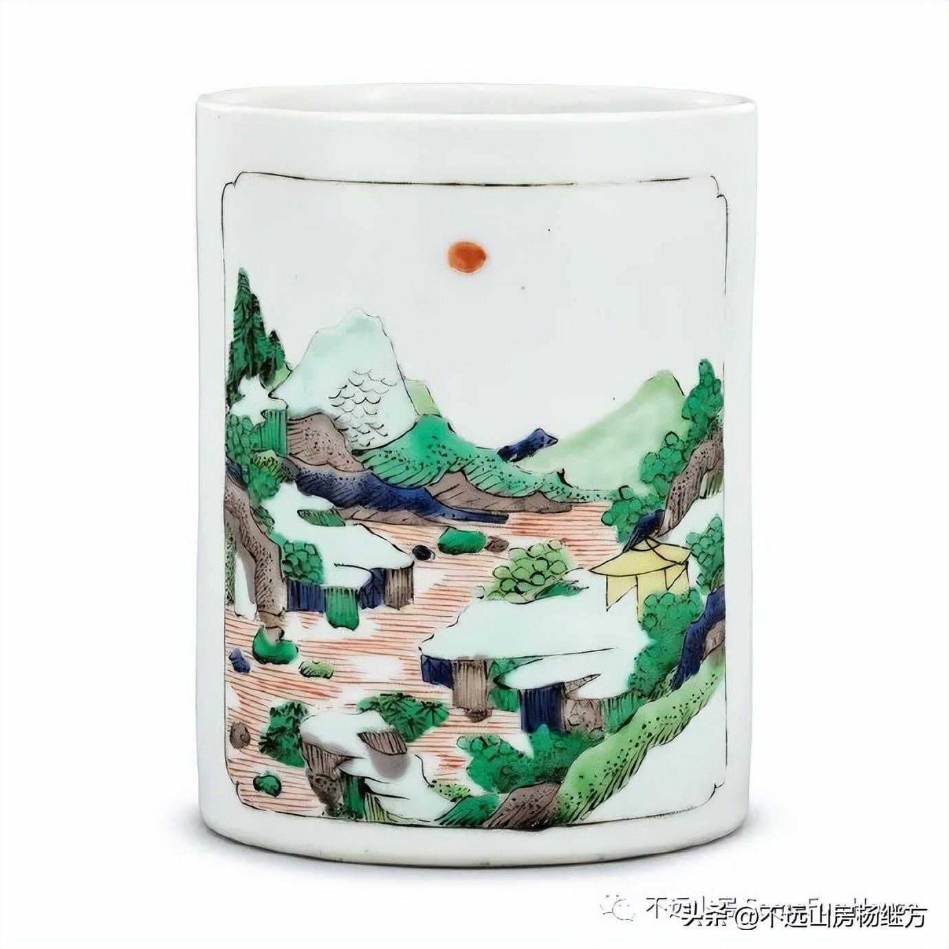 最能体现康熙五彩纹饰特色的是山水人物,层次鲜明,浓淡相宜,对远山近岸,山峦的阴阳反侧,疏落茂密,描绘得出神入化。画画效果讲究意境美,整体给人以疏朗清新、幽靓雅致之感。