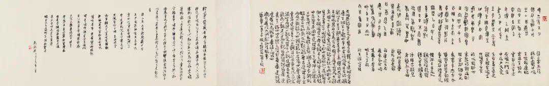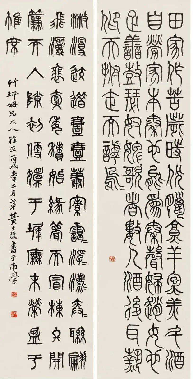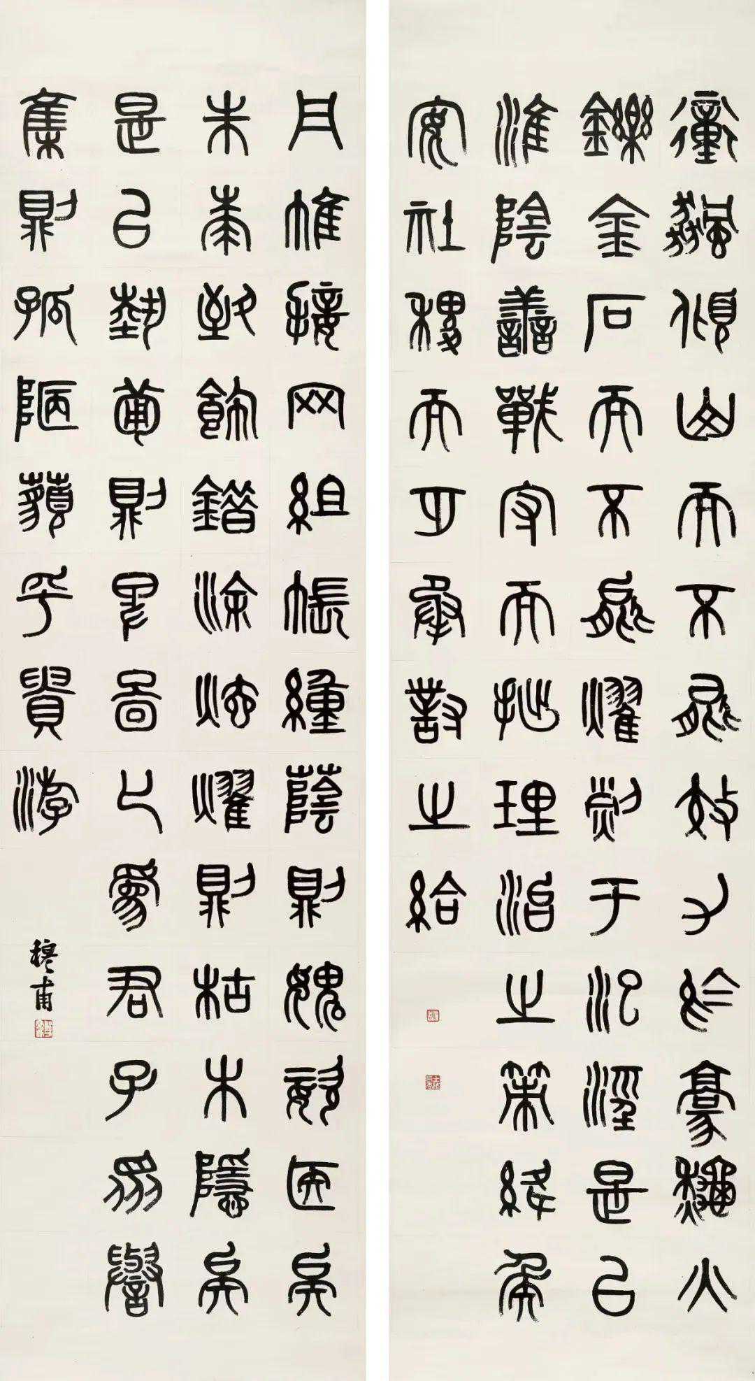 此二条屏,写篆书近百字,内容节录自《抱朴子》,以朱丝栏为界格,整体字距、行距排列整齐,书写端庄大气,结体亦方正,犹如唐楷一般,用笔则内敛、含蓄,线条无半点弱笔,望而知自牧甫笔墨。