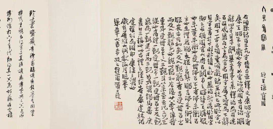 此手卷中,黄士陵篆书临习颂鼎铭文,线条粗细均匀,笔势富有变化,其下则以楷书作释文,卷中其亦洋洋洒洒作“铭文”考据,此对今人的金石学考证有借鉴意义。卷末上海博物馆馆长马承源作跋,亦为之增色。