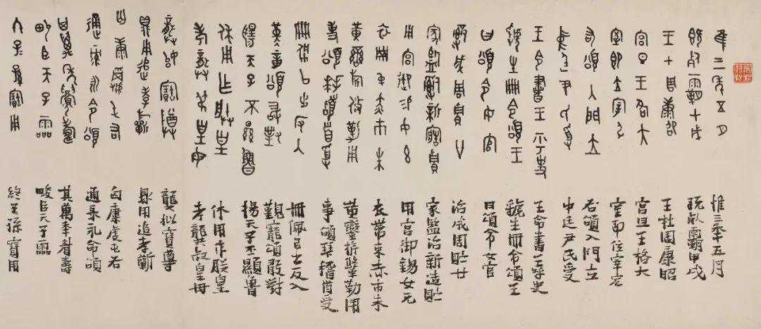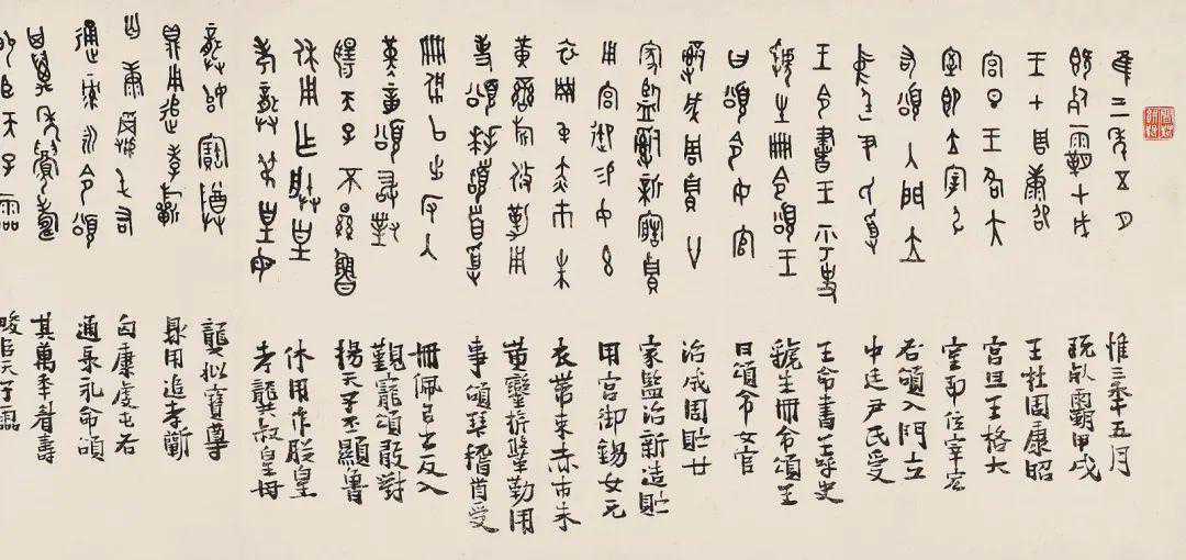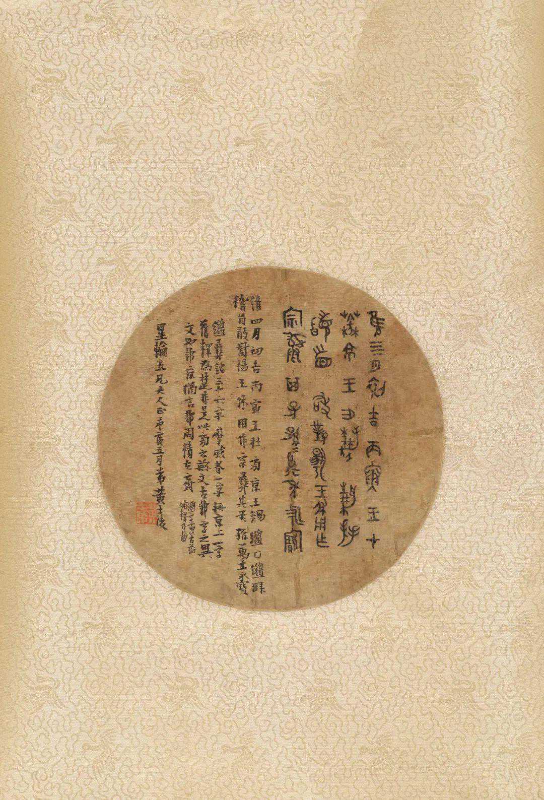 是作布局疏朗,气韵贯通,用笔又顿挫、转折,相较于寻常篆书之古板,此作笔势高古之余,更为灵动,有返璞归真的自然。而“屠维赤奋若”为太岁纪年,其中“屠维”对应“己”,“赤奋若”对应“丑”,故即己丑年(1889)。“且月”为农历六月。
