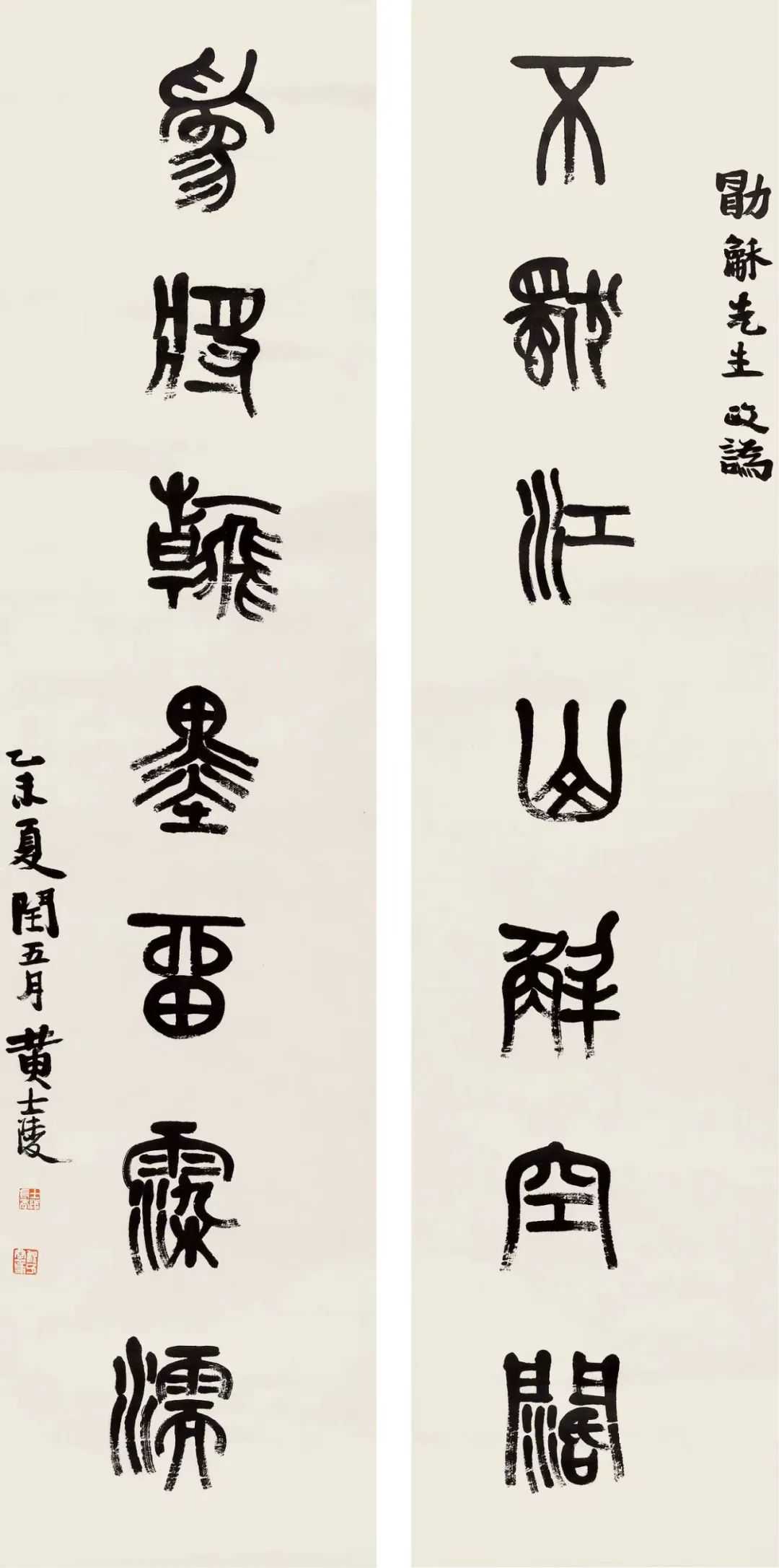 款识“勖龢先生政譌,乙未夏闰五月”知为1895年闰五月所作。此联亦著录于《黄牧甫年表》,载于张华庆主编的《中国大书法:百年人物存公论》P102。