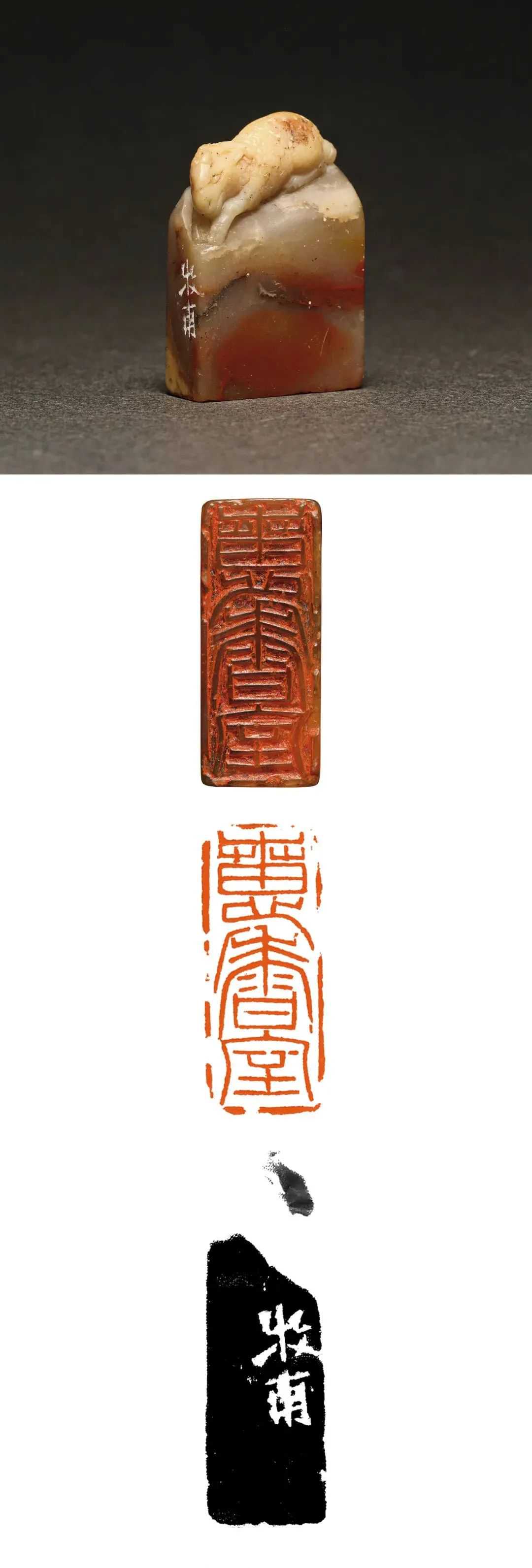 此寿山石博古对章印面四公分有余,形制颇大,又为对章呈现,其一为汉铸白文,其一则为细朱文,二者平正中俱见巧思,可称是黄士陵的代表作之一。