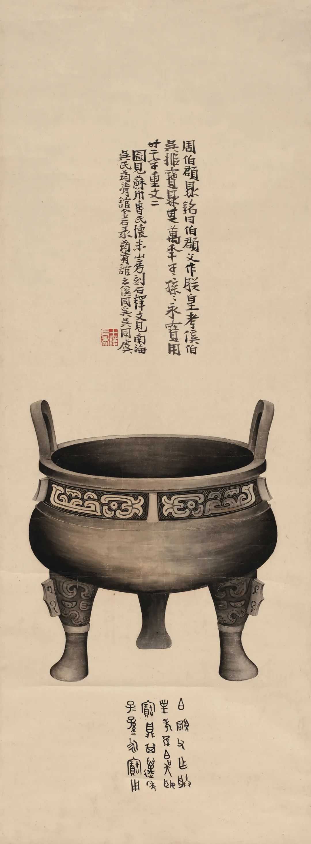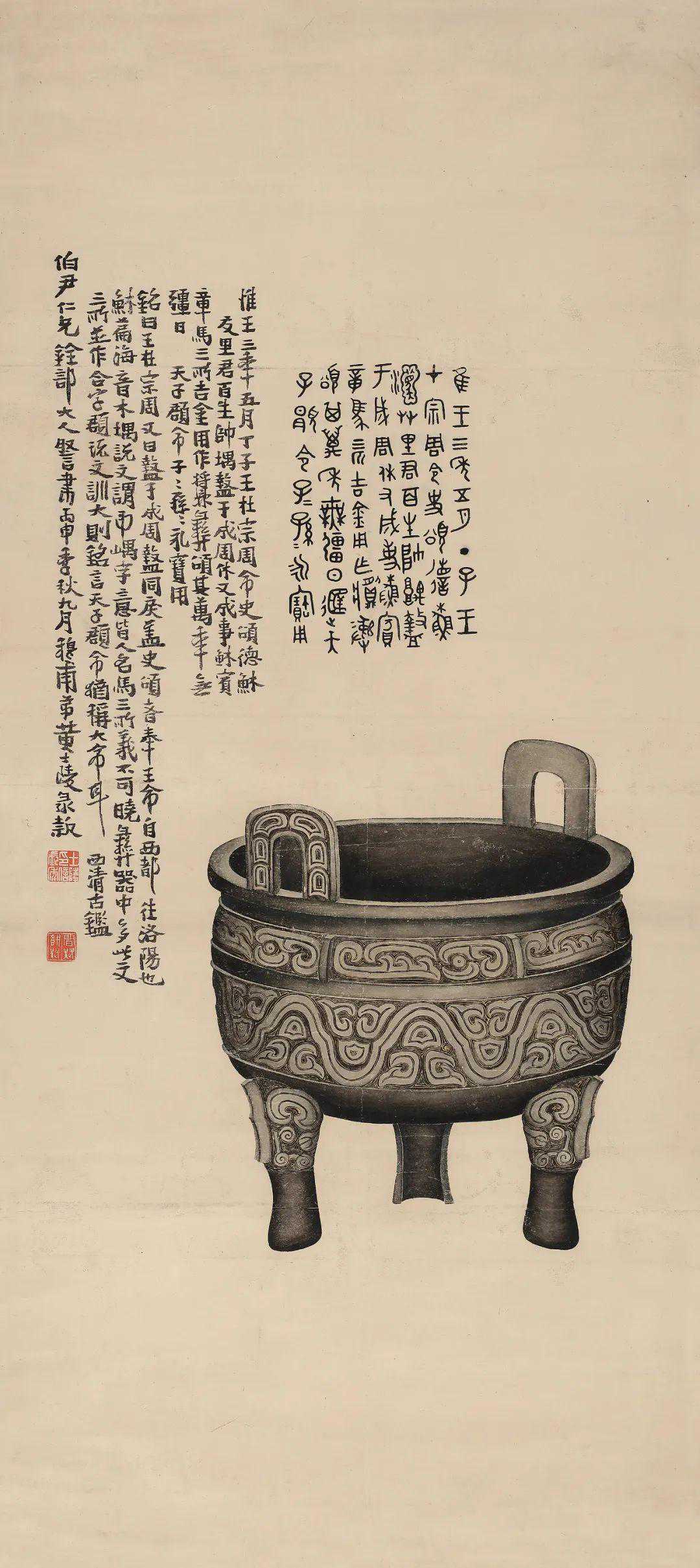 此为黄士陵“史颂鼎博古图”。史颂鼎,西周晚期,口部微敛,下腹外鼓,方唇宽沿,立耳蹄足。是作描绘精细入微,又以金文写铭文,楷书作释文,同时录写《西清古鉴》的考据,堪称“金石永寿,巧夺天工”。