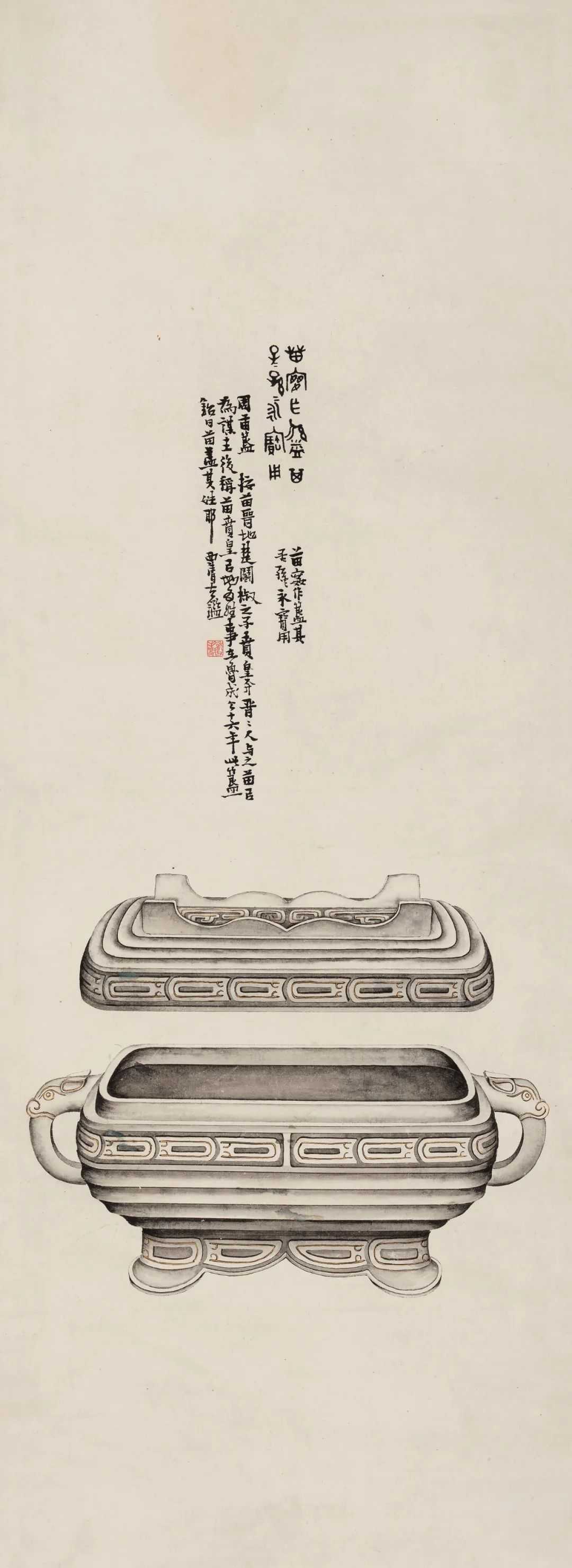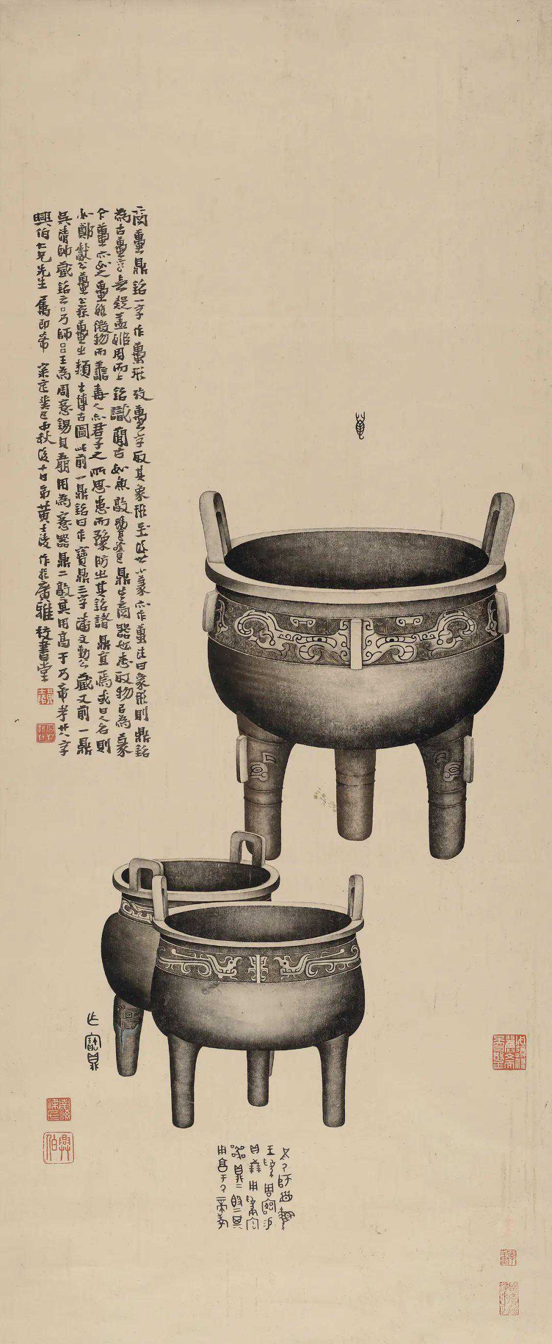 是作绘制造型之准确自不待言,而明暗变化亦是逼真,纹饰也精妙描写,设色古艳,书法则相辅相成,装饰效果甚佳。