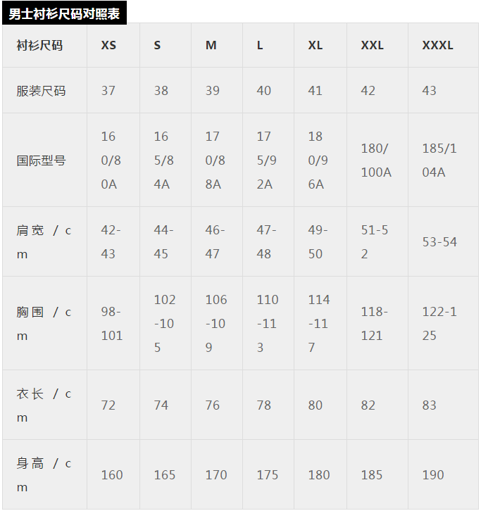 再说衣服,衣服也是一样的,只不过一种变成身高/胸围厘米法,比如165/88A;