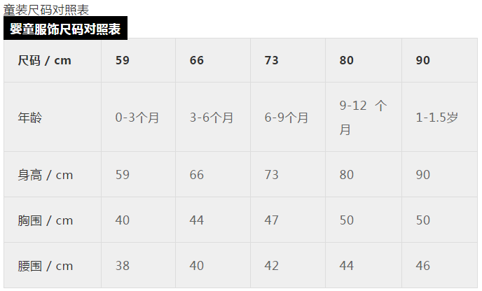 3.宝宝的身材会有差别,本表仅作参考,请根据商品“尺码详细描述”中的衣服尺寸选择合适尺码。