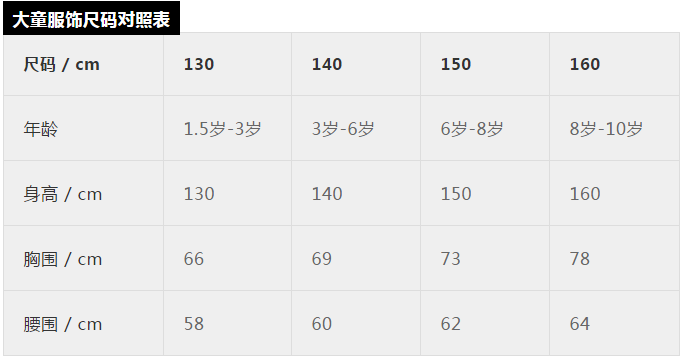 2.除上述尺码组外,童装实际上还有其他的尺码表述方式,其尺码和年龄、身高的对应关系也可参考上表。