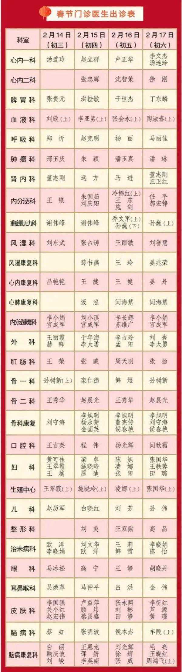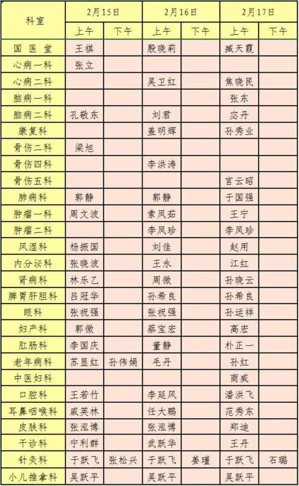 二、2月11日(农历三十)至2月14日(初三)门诊停诊;2月15日(初四)至2月17日(初六)门诊具体安排如下: