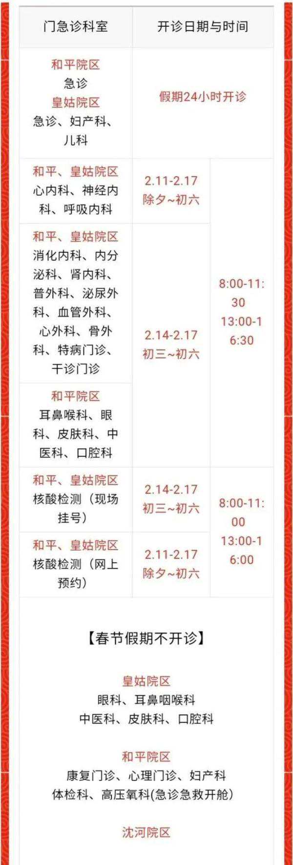 1.2月11日(除夕)至13日(初二)急诊、发热门诊24小时开诊,2月14日(初三)至17日(初六)门诊、急诊、发热门诊均开放,春节假期特病门诊、便民门诊停诊;
