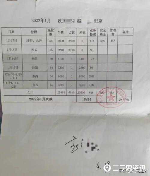 记者在李女士提供的部分出车清单中看到,车牌号陕J62**2的具体出车日期、行程、车费等内容,清单上有赵先生的名字及盖有“延安市方圆旅游汽车有限责任公司车辆调度专用章”。