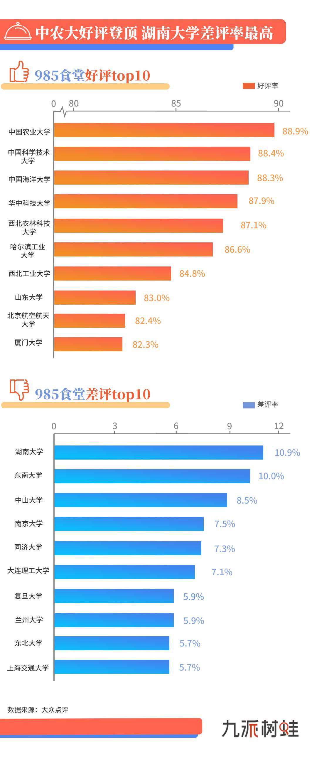 而大学食堂的滋味,将承载莘莘学子的青春记忆。九派新闻根据大众点评的数据,选取了中国39所“985”高校里189座有点评记录的高校食堂。通过整理2.8万条食堂评价,试图找出在中国最顶流的高校里,哪家食堂才是最受认可的。