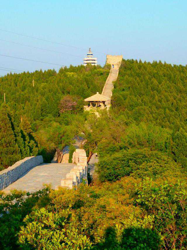 蓝天下,长城在丛林之中,格外醒目。古色古香的长城亭,诉说着昨天的故事。齐长城工程浩大,比秦长城早了490年。